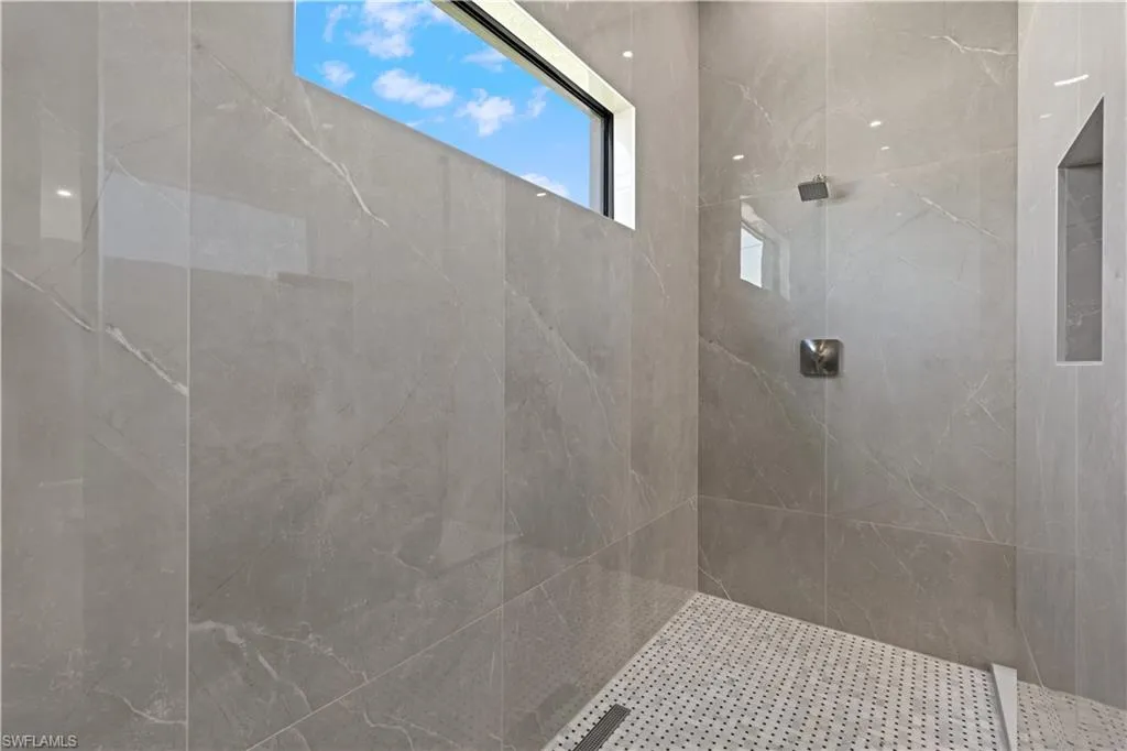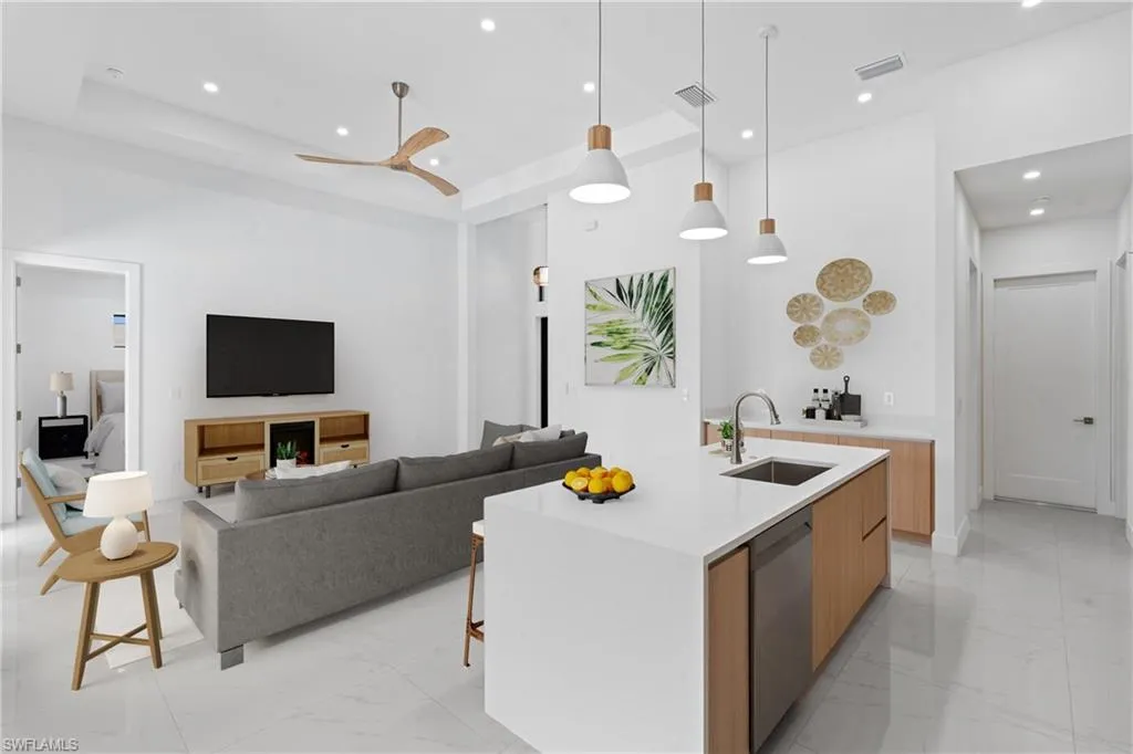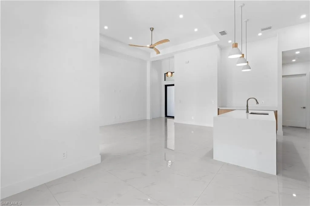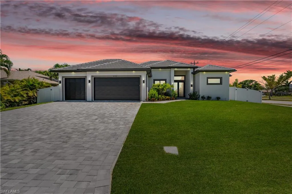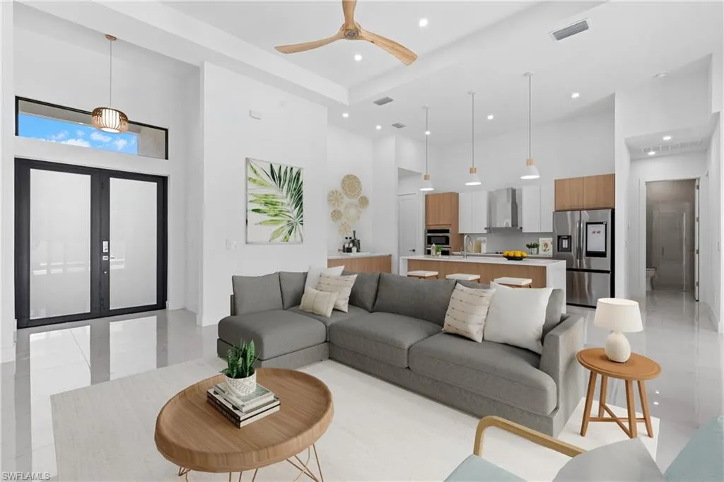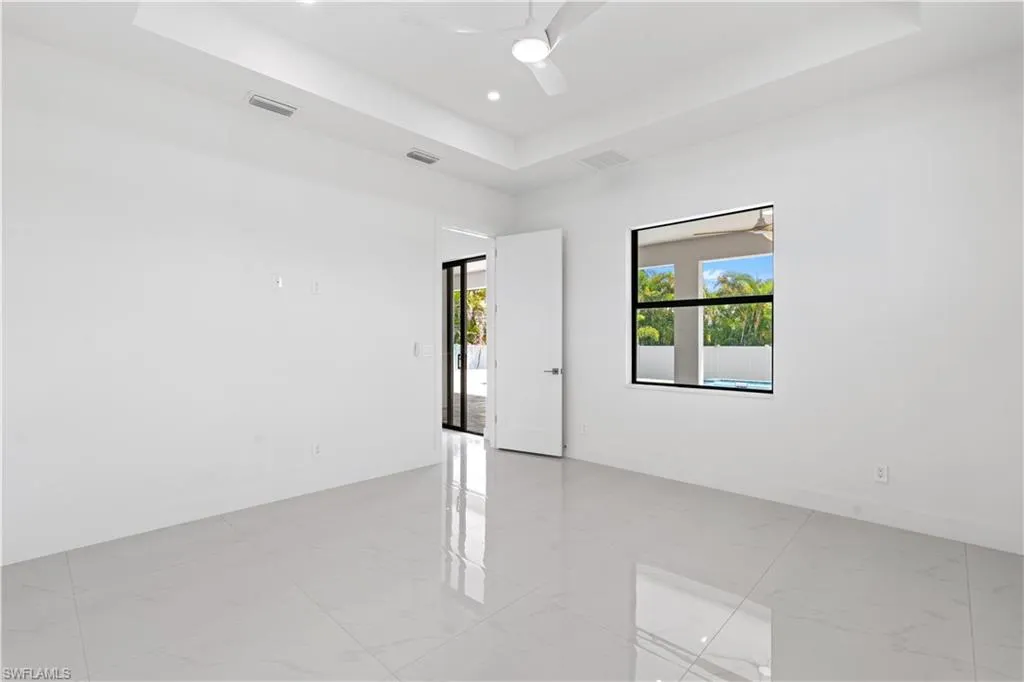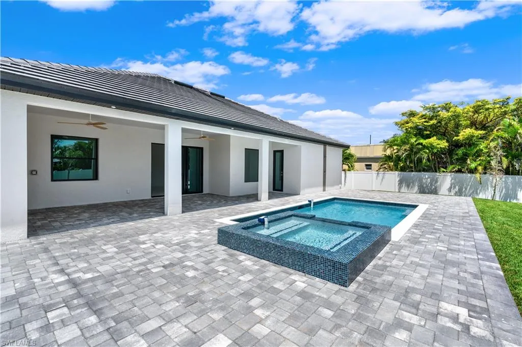Stunning new construction home, built with hurricane impact windows and doors, a sleek modern tile roof, offering 4 bedrooms, 3 bathrooms, 3 car garage, and 1,931 sqft of living space on a desirable corner lot in SW Cape Coral. Enter through elegant French doors with frosted glass panels into a bright, open layout featuring large polished marble tile flooring throughout and soaring ceilings with recessed lighting. The modern kitchen showcases quartz countertops, light wood cabinetry with sleek white uppers, and pendant lighting above the spacious island. The primary suite includes two walk-in closets with custom built-in shelving, and a luxurious spa-like bath with a freestanding soaking tub, dual walk-in showers with frameless glass enclosures, double vanity with quartz countertops, and recessed lighting. Three additional bedrooms offer modern comfort with ceiling fans, walk-in closets and access to two additional full bathrooms, one being an additional ensuite and a pool bath that leads outdoors. The home also includes a dedicated laundry room with a wash sink for added convenience. Wall-to-wall sliding glass doors open to a covered lanai with a built-in outdoor kitchen, private pool and spa, outdoor shower and a fully fenced backyard—ideal for entertaining or relaxing in privacy. Prime location surround by beautiful homes with quick access to Cape Harbour, Tarpon Point, Sands Park, Downtown Cape Coral, and nearby beaches. Some photos include virtual staging. *DESIGN SERVICES INCLUDED, MAKING IT EASY FOR THE BUYER TO FURNISH THE PROPERTY AS SHOW*
