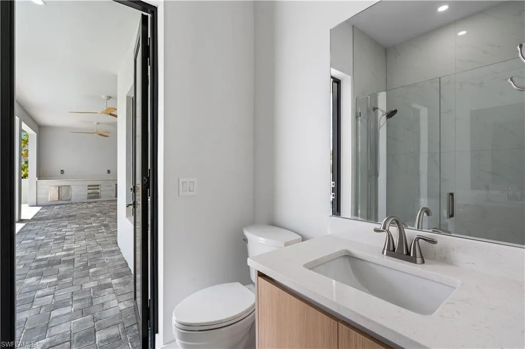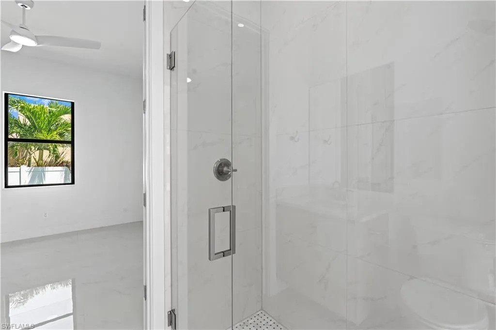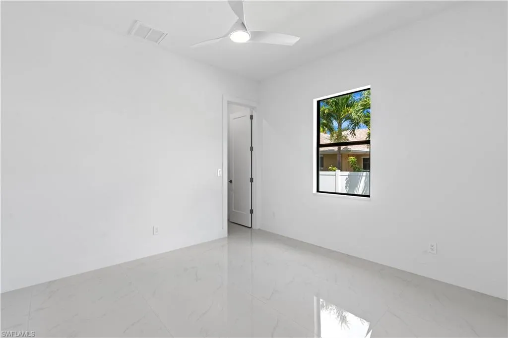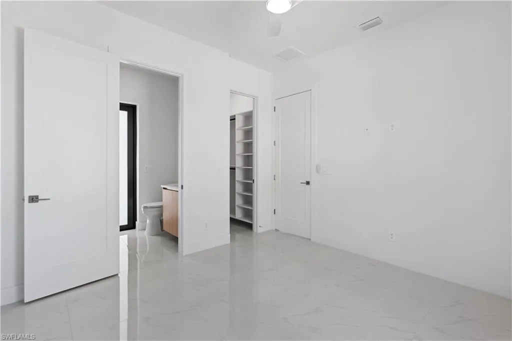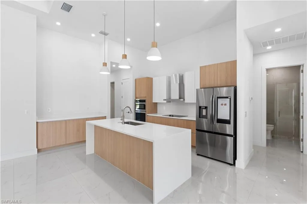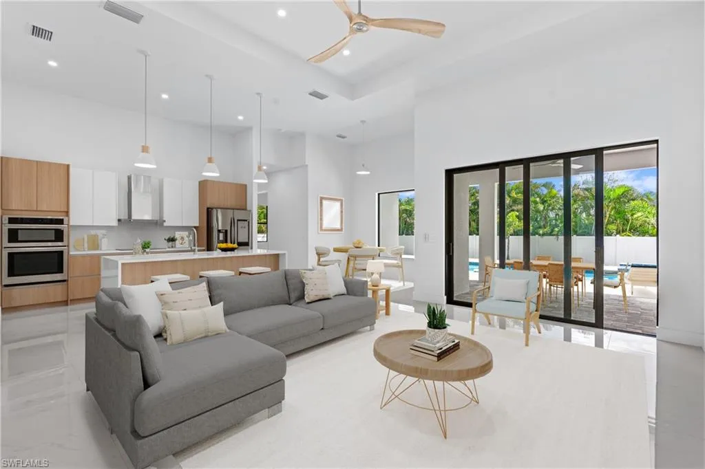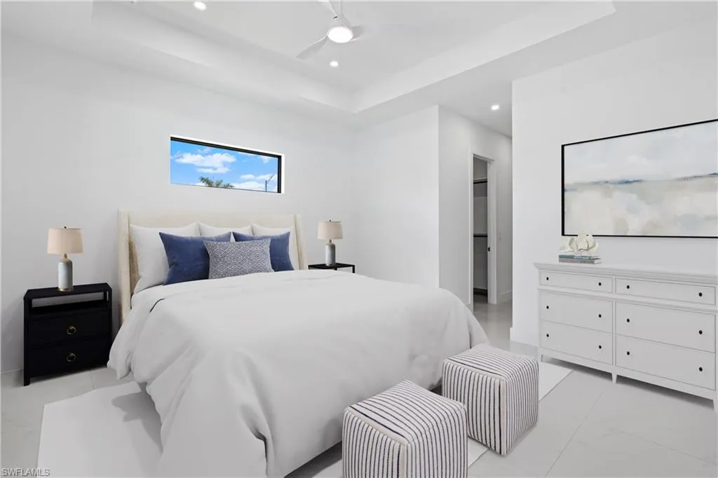 Stunning new construction home, built with hurricane impact windows and doors, a sleek modern tile roof, offering 4 bedrooms, 3 bathrooms, 3 car garage, and 1,931 sqft of living space on a desirable corner lot in SW Cape Coral. Enter through elegant French doors with frosted glass panels into a bright, open layout featuring large polished marble tile flooring throughout and soaring ceilings with recessed lighting. The modern kitchen showcases quartz countertops, light wood cabinetry with sleek white uppers, and pendant lighting above the spacious island. The primary suite includes two walk-in closets with custom built-in shelving, and a luxurious spa-like bath with a freestanding soaking tub, dual walk-in showers with frameless glass enclosures, double vanity with quartz countertops, and recessed lighting. Three additional bedrooms offer modern comfort with ceiling fans, walk-in closets and access to two additional full bathrooms, one being an additional ensuite and a pool bath that leads outdoors. The home also includes a dedicated laundry room with a wash sink for added convenience. Wall-to-wall sliding glass doors open to a covered lanai with a built-in outdoor kitchen, private pool and spa, outdoor shower and a fully fenced backyard—ideal for entertaining or relaxing in privacy. Prime location surround by beautiful homes with quick access to Cape Harbour, Tarpon Point, Sands Park, Downtown Cape Coral, and nearby beaches. Some photos include virtual staging. *DESIGN SERVICES INCLUDED, MAKING IT EASY FOR THE BUYER TO FURNISH THE PROPERTY AS SHOW*