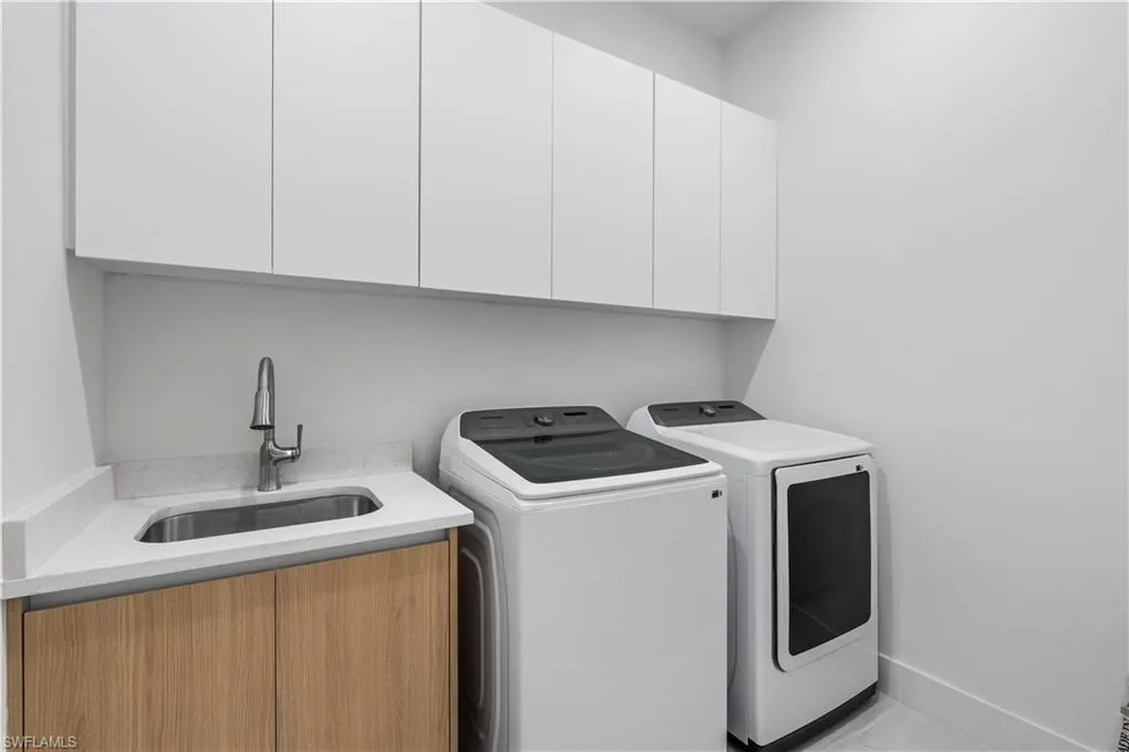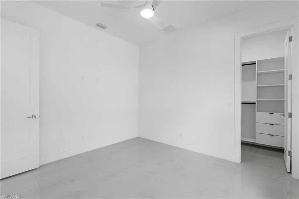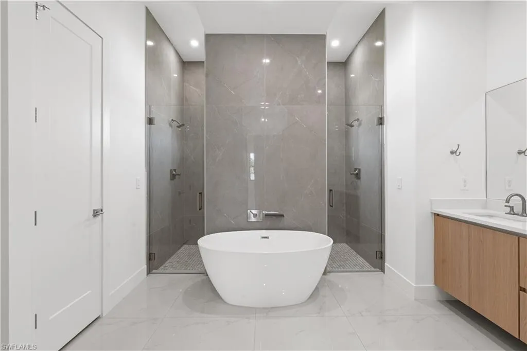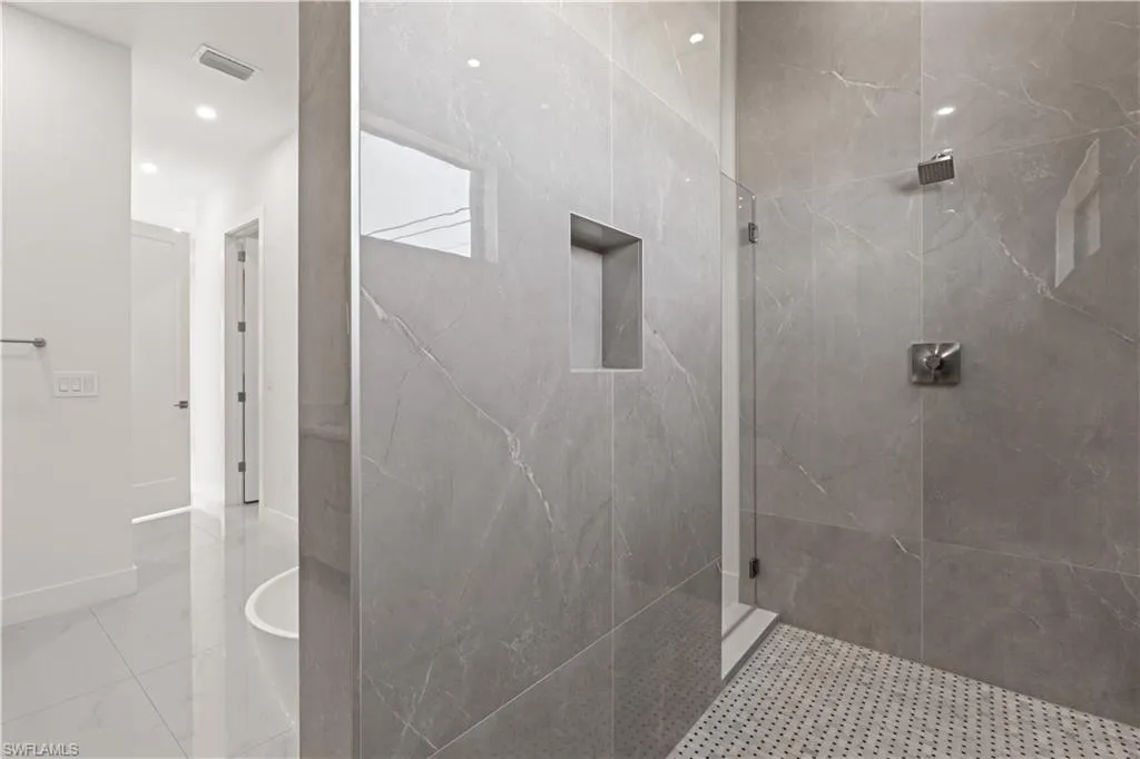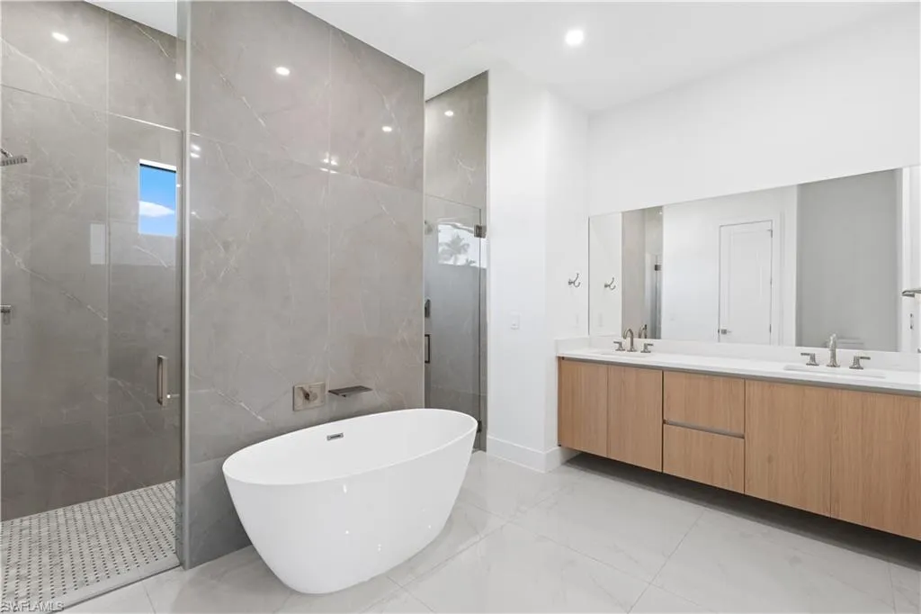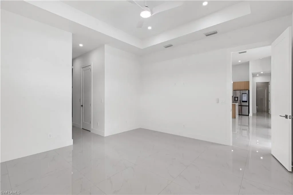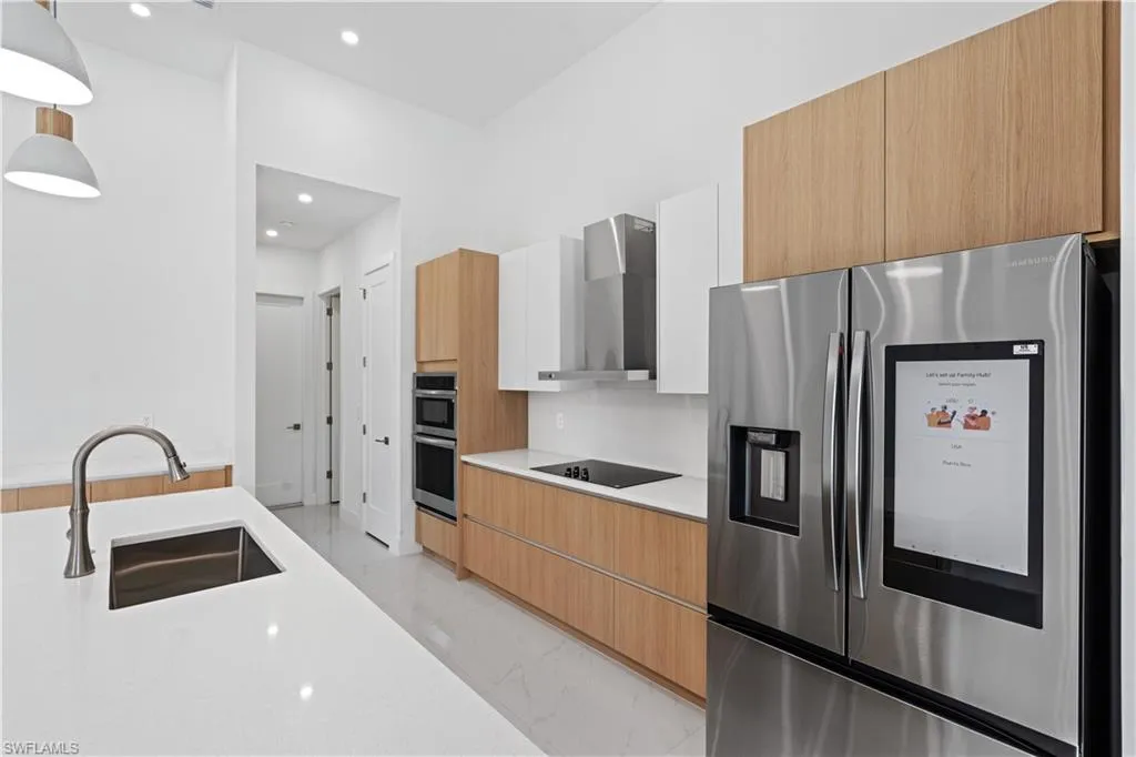 Stunning new construction home, built with hurricane impact windows and doors, a sleek modern tile roof, offering 4 bedrooms, 3 bathrooms, 3 car garage, and 1,931 sqft of living space on a desirable corner lot in SW Cape Coral. Enter through elegant French doors with frosted glass panels into a bright, open layout featuring large polished marble tile flooring throughout and soaring ceilings with recessed lighting. The modern kitchen showcases quartz countertops, light wood cabinetry with sleek white uppers, and pendant lighting above the spacious island. The primary suite includes two walk-in closets with custom built-in shelving, and a luxurious spa-like bath with a freestanding soaking tub, dual walk-in showers with frameless glass enclosures, double vanity with quartz countertops, and recessed lighting. Three additional bedrooms offer modern comfort with ceiling fans, walk-in closets and access to two additional full bathrooms, one being an additional ensuite and a pool bath that leads outdoors. The home also includes a dedicated laundry room with a wash sink for added convenience. Wall-to-wall sliding glass doors open to a covered lanai with a built-in outdoor kitchen, private pool and spa, outdoor shower and a fully fenced backyard—ideal for entertaining or relaxing in privacy. Prime location surround by beautiful homes with quick access to Cape Harbour, Tarpon Point, Sands Park, Downtown Cape Coral, and nearby beaches. Some photos include virtual staging. *DESIGN SERVICES INCLUDED, MAKING IT EASY FOR THE BUYER TO FURNISH THE PROPERTY AS SHOW*