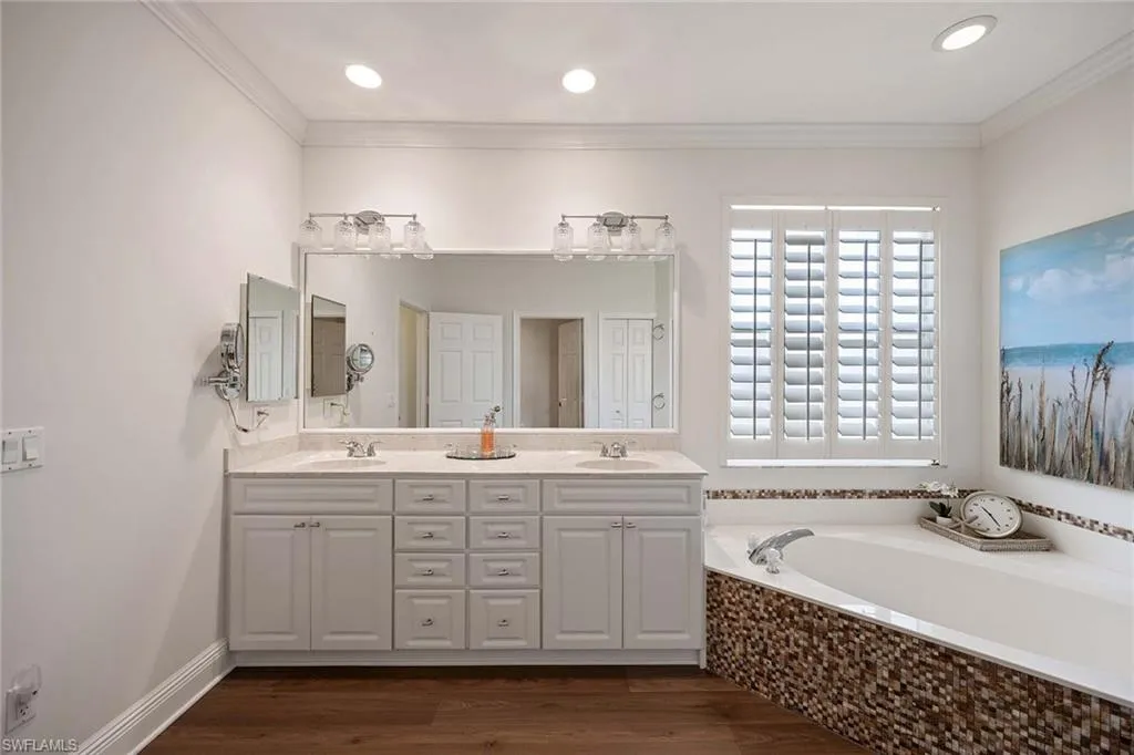 Great location in Fiddler’s Creek, this charming single-family home in Pepper Tree is minutes from the main entrance as well as the world-class club, spa and fitness center. Ideally with a stunning lake view, this exceptional two-story home includes four bedrooms, three baths and the warm feeling that embraces the essence of South Florida living. The expansive combination living and dining area is roomy and open, drawing you into the open vaulted ceilings and the additional Jack and Jill guest bedrooms of the second floor. A spacious family room and an open kitchen create a bright environment that rivals only the sun-drenched patio of the back lanai. Two-story high ceilings with crown moldings enhance this newly painted, delightful home. The recently remodeled kitchen and lighting throughout are also special features. The extra-large outdoor space is fully screened with room for a full-sized pool and spa. The fourth bedroom, on the main level with a full bath, can efficiently serve as an office or den. Across the hall, the primary bedroom suite opens to the rear lanai and includes two walk-in closets. The master bath with dual sink, separate shower, and garden bath is roomy and bright. Stunning new wood flooring adds to the home’s comfortable and sophisticated feel. Additional features of this exceptional home include a remodeled laundry room, central vacuum system and a 10-year transferable warranty for the air conditioner. The refinished garage floor, overhead enclosed cabinetry, extra-wide driveway and plantation shutter window treatments show attention to detail. Fiddler’s Creek is an amenity-rich country club environment with a full-service spa, fitness and wellness center with pickleball, bocce ball, tennis and more. A full-time recreation director and two exceptional restaurants complete the picture of luxurious living, close to everything South Florida has to offer.