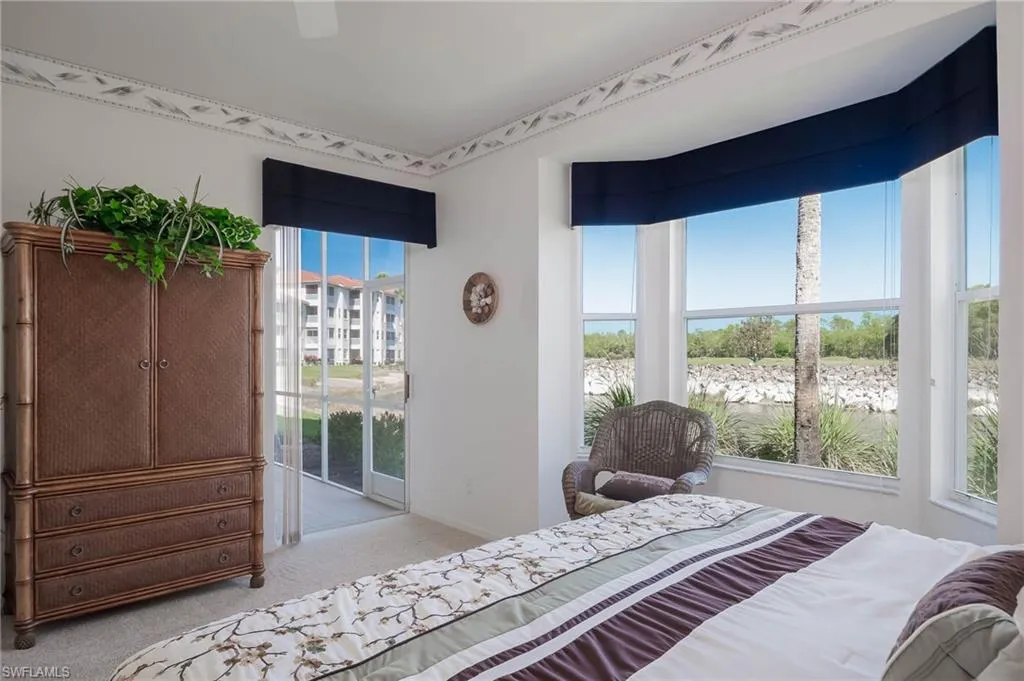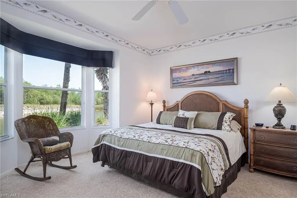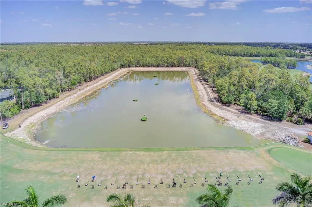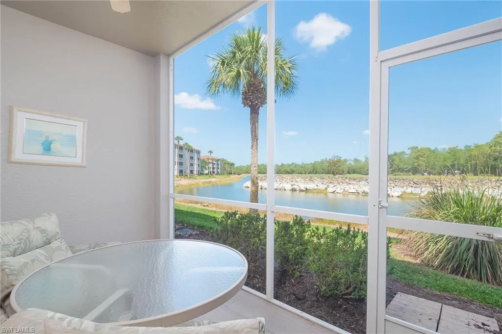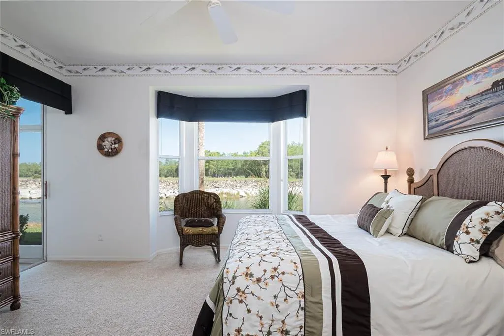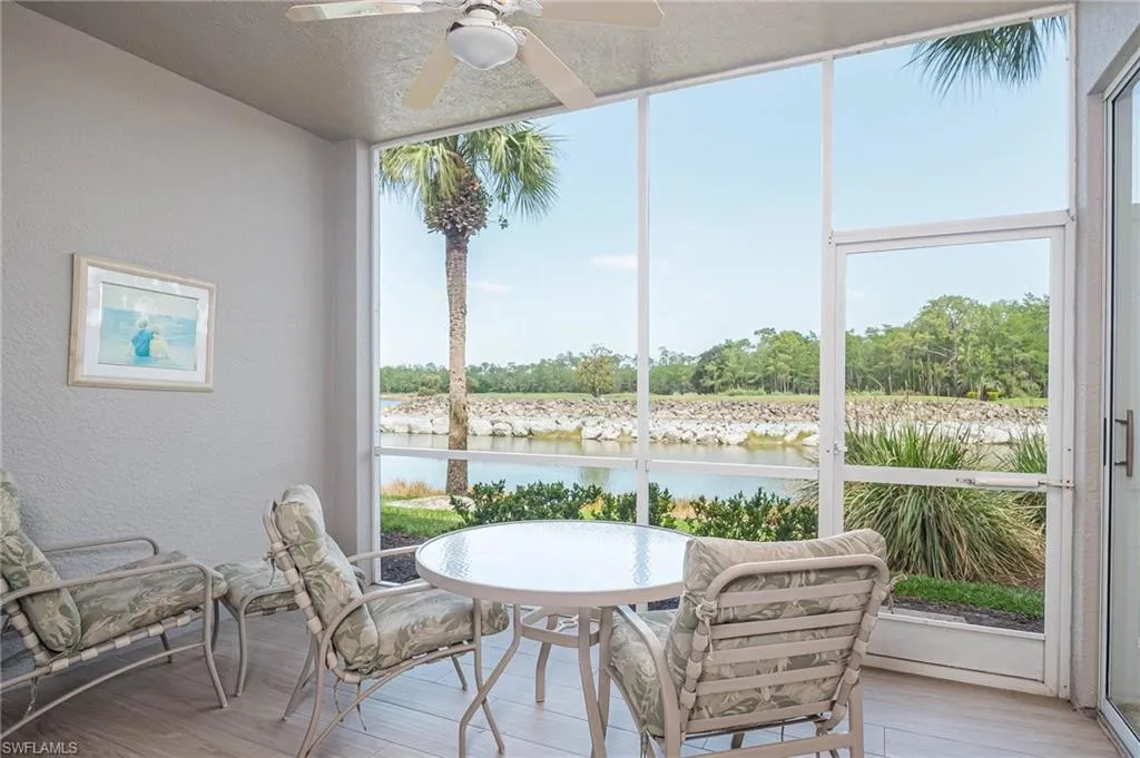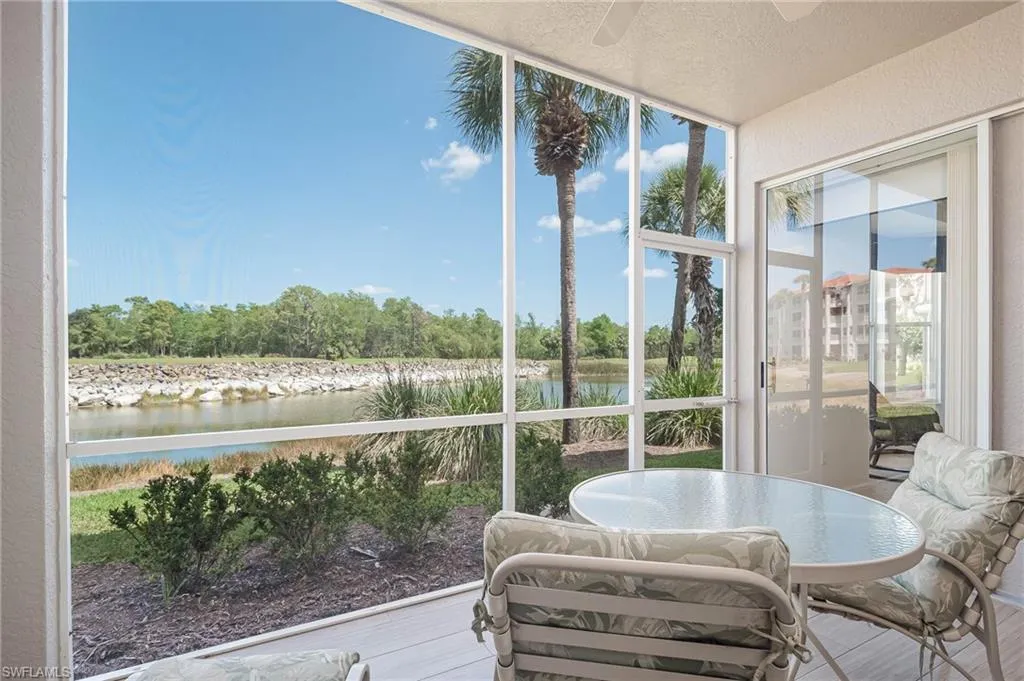 The primary bedroom is spacious and overlooks the water and golf course. The 2nd full bedroom and bathroom are oversized and can easily host family and friends The master bath has been updated and has two walk-in closets in the private ensuite. The patio has direct water and golf views with no homes blocking this priceless view. Naples Heritage offers and 18 hole bundled golf course, pro shop, putting green & driving range. The community offers a newly renovated clubhouse, restaurant, poolside cabana & bar. There is a wonderful fitness center with tennis, pickle ball and bocce to enjoy year round living or our winter residents. Naples Heritage is centrally located 3 miles from I-75 going to either Miami or Tampa, the new Great Wolf Lodge 2 miles from the community, Florida Sports Park and within 5 miles to the shoppes, restaurants and entertainment of Naples premier shopping destination 5th Avenue. Seed 2 Table is rebuilding on Davis Blvd and the new convention center is 4 miles from Naples Heritage. Welcome Home!