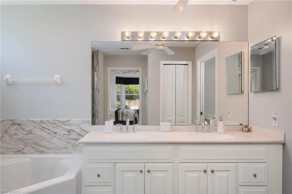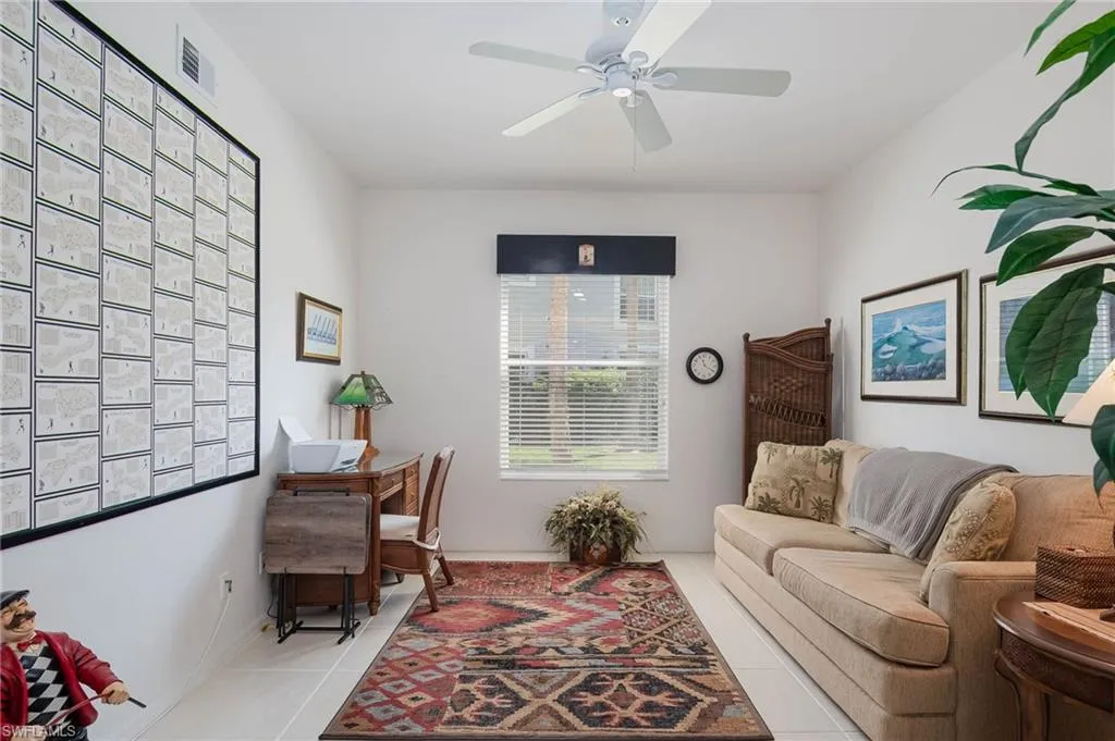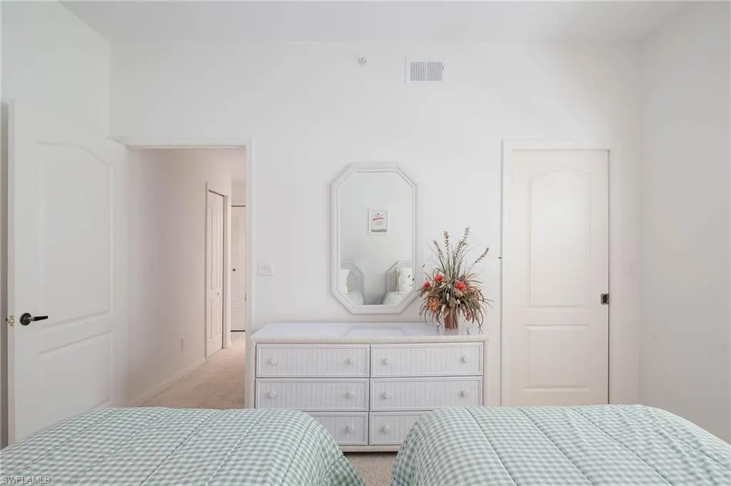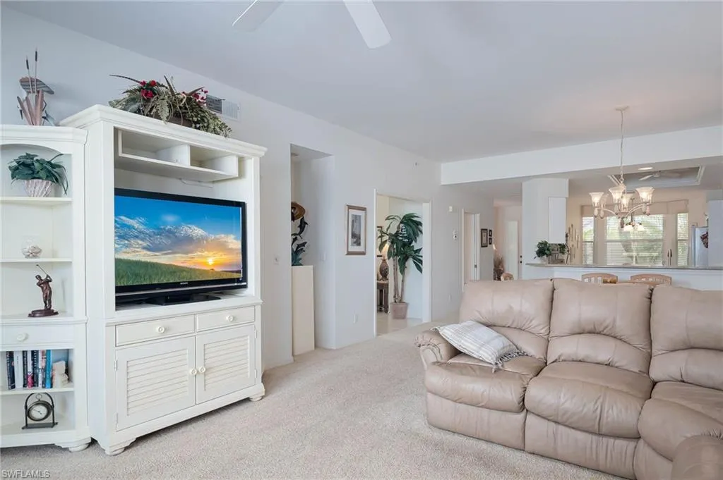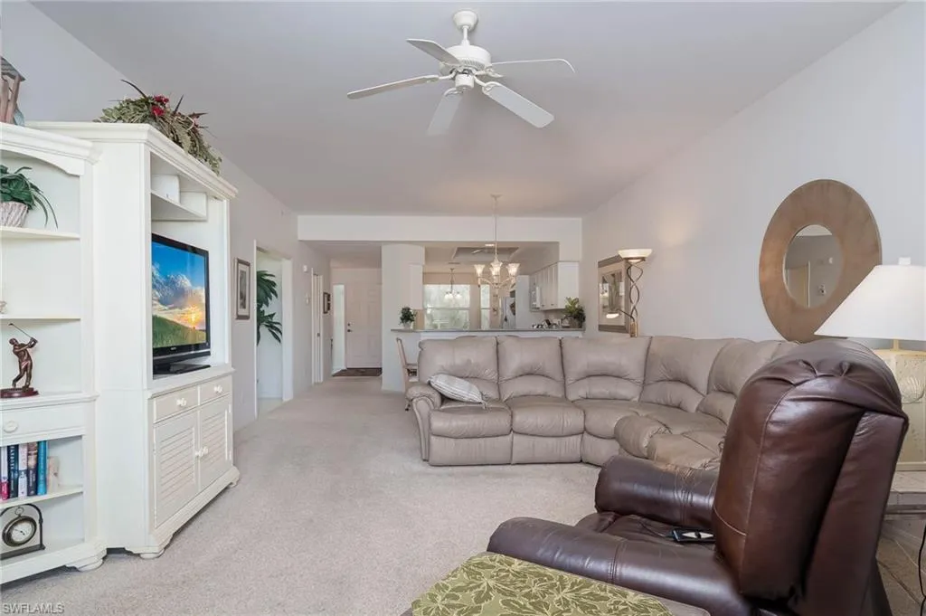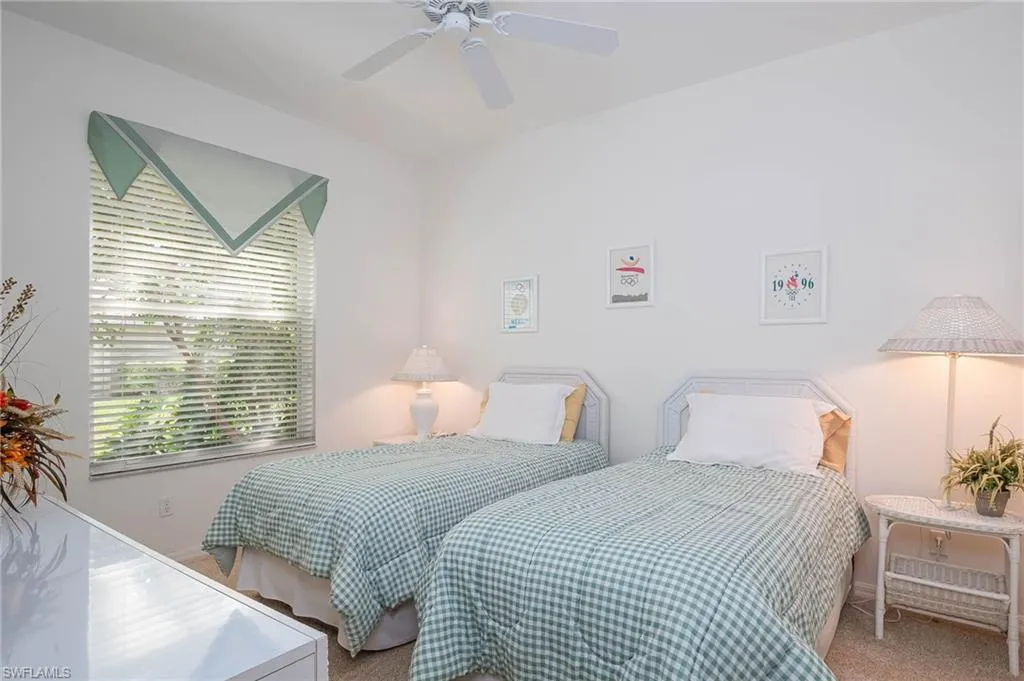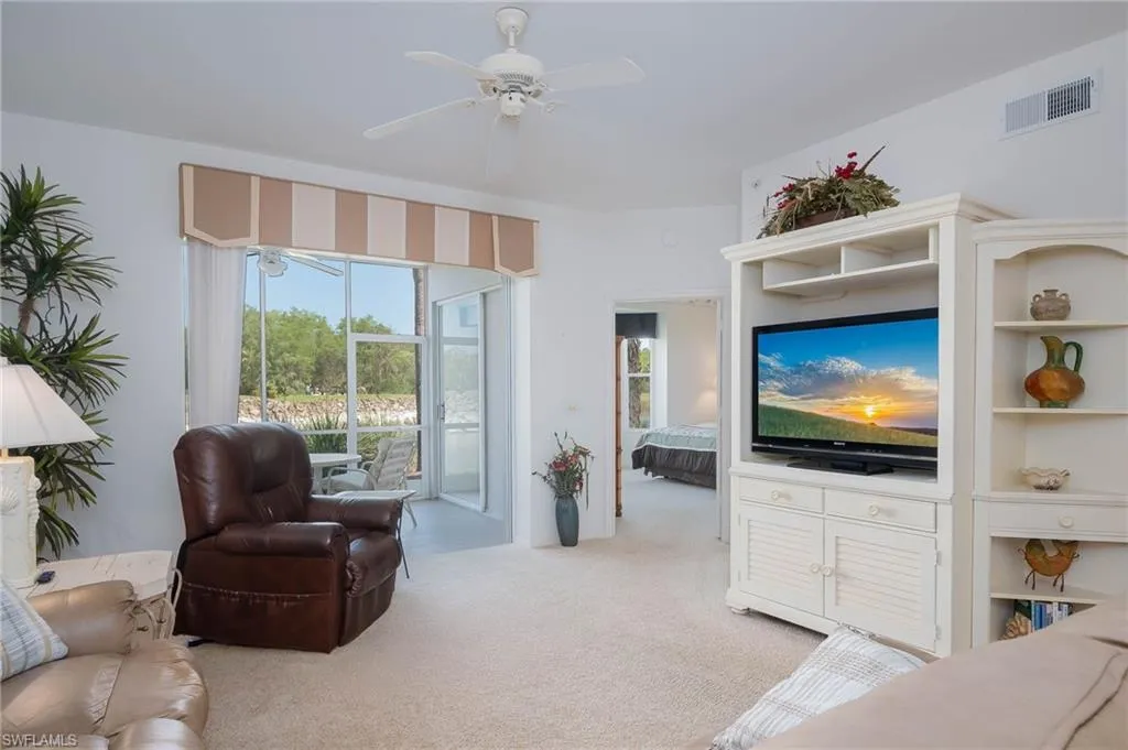 The primary bedroom is spacious and overlooks the water and golf course. The 2nd full bedroom and bathroom are oversized and can easily host family and friends The master bath has been updated and has two walk-in closets in the private ensuite. The patio has direct water and golf views with no homes blocking this priceless view. Naples Heritage offers and 18 hole bundled golf course, pro shop, putting green & driving range. The community offers a newly renovated clubhouse, restaurant, poolside cabana & bar. There is a wonderful fitness center with tennis, pickle ball and bocce to enjoy year round living or our winter residents. Naples Heritage is centrally located 3 miles from I-75 going to either Miami or Tampa, the new Great Wolf Lodge 2 miles from the community, Florida Sports Park and within 5 miles to the shoppes, restaurants and entertainment of Naples premier shopping destination 5th Avenue. Seed 2 Table is rebuilding on Davis Blvd and the new convention center is 4 miles from Naples Heritage. Welcome Home!