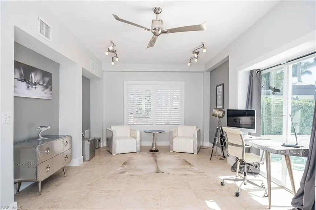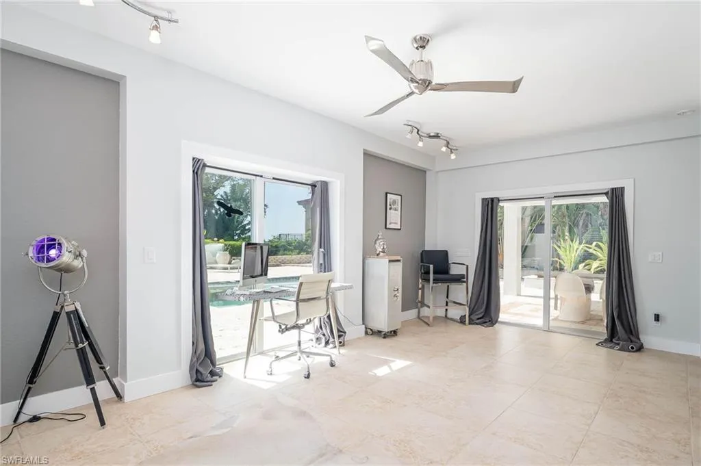 The solar/electric-heated saltwater pool and travertine-and-marble-clad terrace overlook the Caloosahatchee River, framed by mature bamboo and tropical gardens. Soft music flows through integrated speakers, and ceiling fans cool the lanai, setting the stage for unforgettable evenings under the stars.