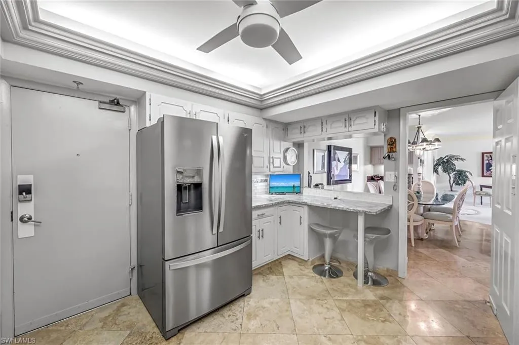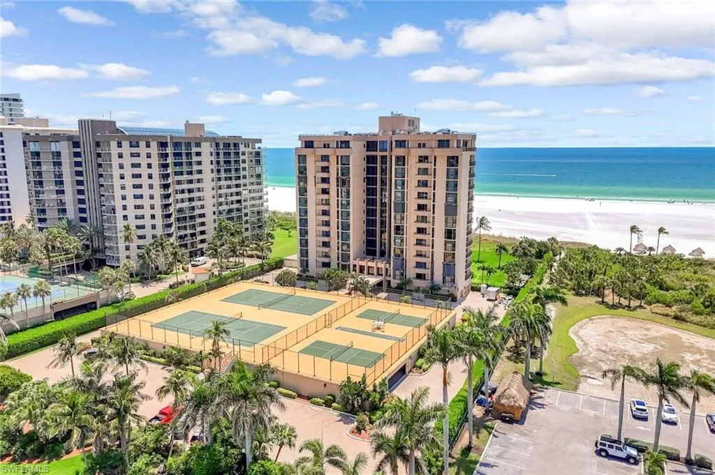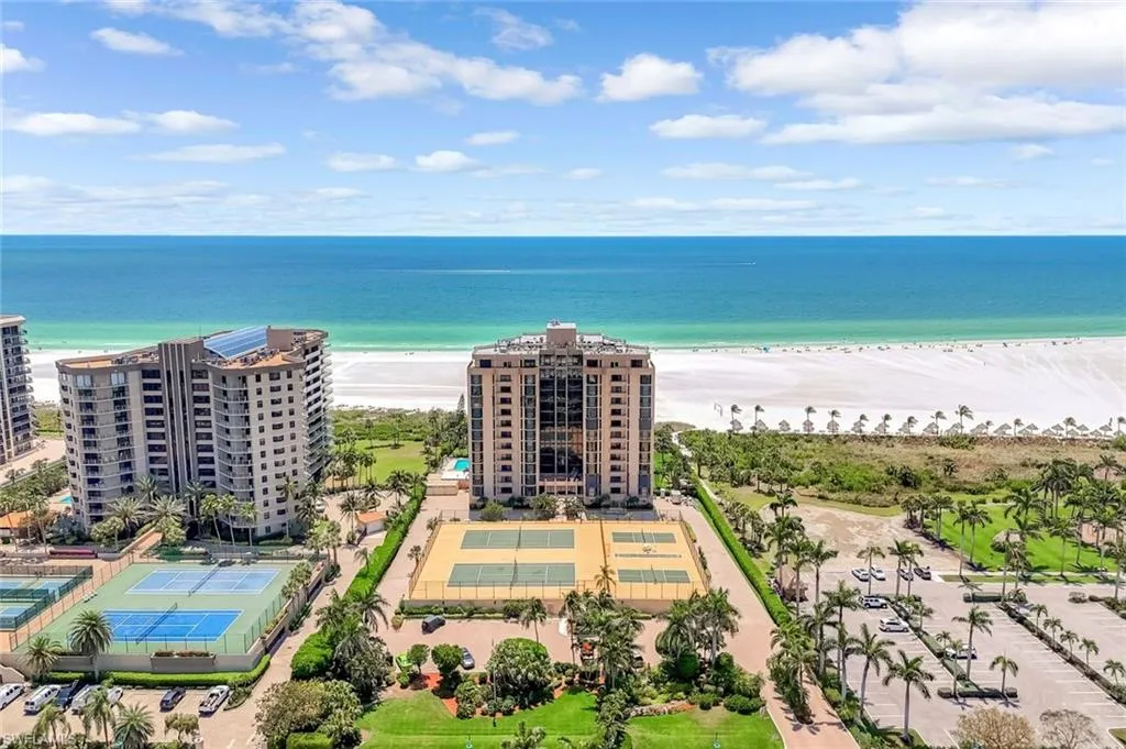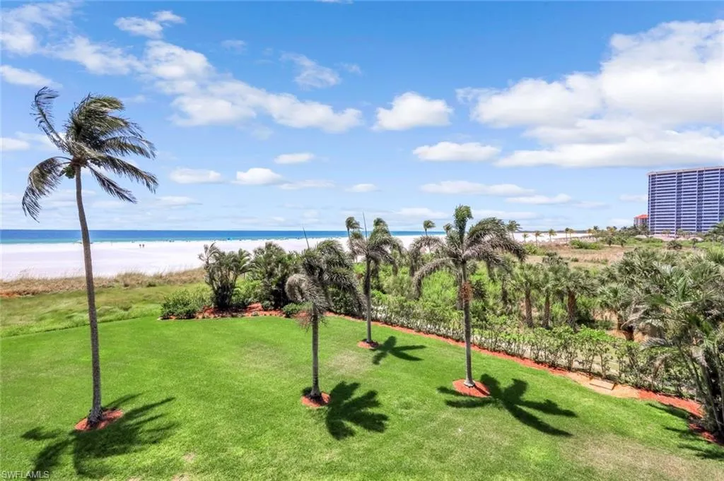 Gulf-Front Luxury with Private Beach Access. Experience the pinnacle of coastal living in this elegant beachfront condominium residence at the prestigious Princess Del Mar. Perfectly positioned on the Gulf of Mexico at the center of Marco Island’s crescent beach; this third-floor, 2 BED | 2 BATH condo offers sweeping Gulf and sand views, open green space vistas, private beach access, and a resort-style lifestyle tailored to the discerning buyer. Spanning 1,550 square feet, the home features impact-rated windows and doors and tasteful high-end finishes like crown molding, diagonally laid tile with plush carpeting, and a luminous open-concept design living and dining area with wet bar. The gourmet kitchen includes ample white cabinetry with underlighting, granite countertops, glass tile backsplash, stainless steel appliances, a cozy breakfast bar for kitchen chats, a spacious pantry and it features a tray ceiling with ambient lighting. A spacious living area opens via corner wall slider’s to a large 33 ft lanai with uninterrupted Gulf vistas, ideal for catching the stunning sunset. The primary suite offers spa-inspired luxury with three closets and a serene en-suite bath. A well-appointed guest suite features wood floors with built-ins for generous storage that doubles as office space, with its own private balcony. Additional highlights include in-unit laundry, garage parking #54, storage locker #304, and premium amenities: a Gulf-facing pool and spa, fitness center, guest suites, tennis, pickleball, shuffleboard, library and more. Princess Del Mar sets the standard for beachfront elegance on Marco Island