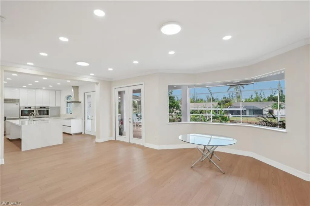 Step into refined elegance with a formal dining room and an open-concept living area that blends seamlessly with the outdoors. In the kitchen and dining area, two sets of double French doors open to the expansive screened-in lanai, creating the perfect indoor-outdoor living experience.