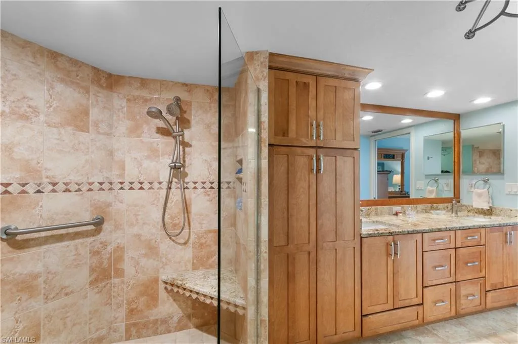 The updated kitchen features white cabinets, pull-out drawers, and granite countertops. Both bathrooms have been fully remodeled, featuring custom cabinetry and expansive tiled showers with glass enclosures.