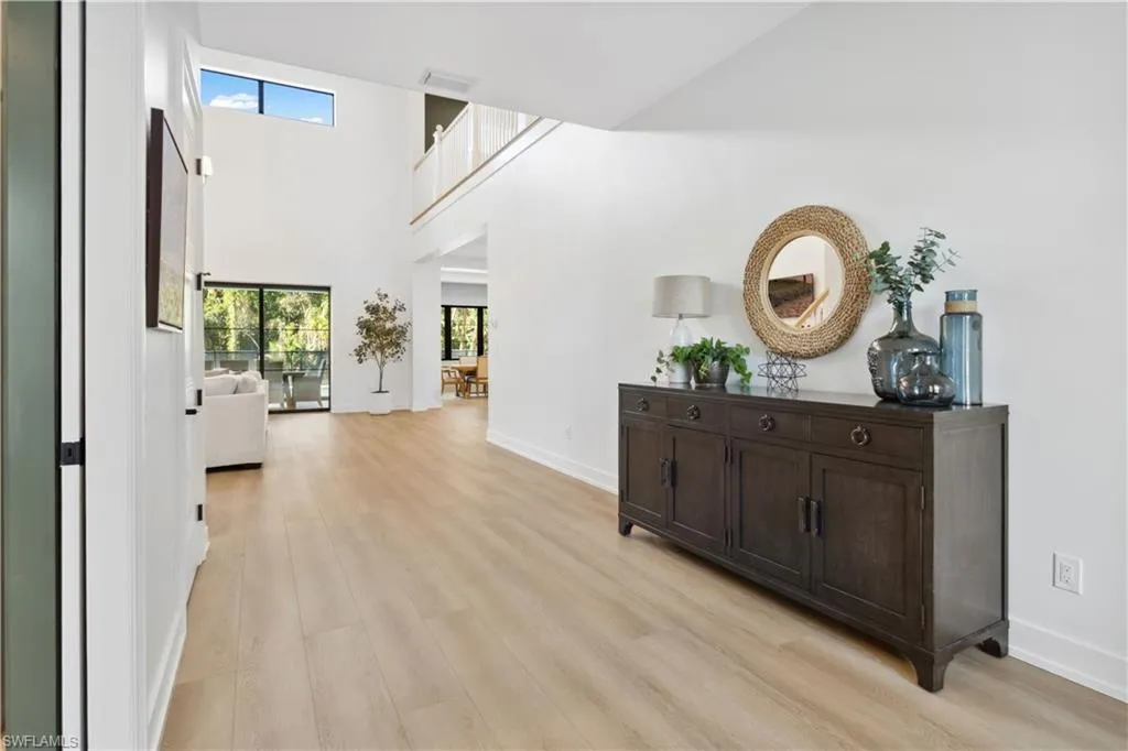– Soaring 21-foot ceilings in the main living area with an elegant electric fireplace and custom wood