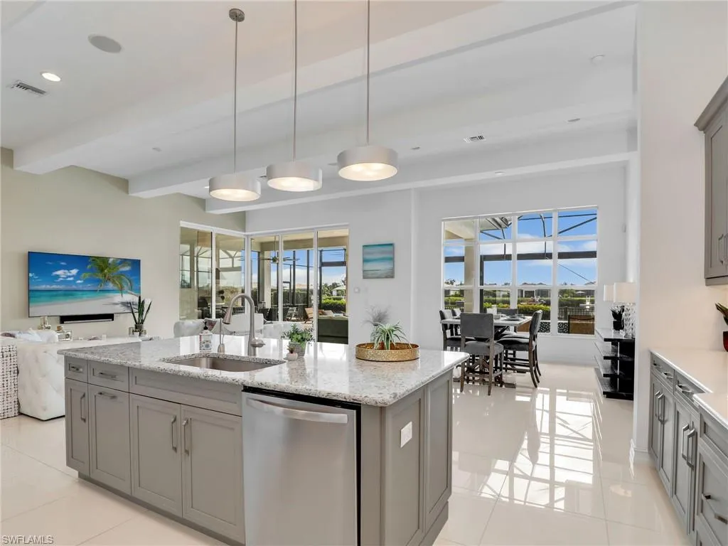 The spacious great room showcases water and mangrove views, highlighted by custom ceiling beams and natural light. At the heart of the home, the gourmet kitchen features quartz countertops, an oversized island, induction cooktop, wall oven, walk-in pantry, and a butler’s pantry with added storage—perfect for everyday living and entertaining.