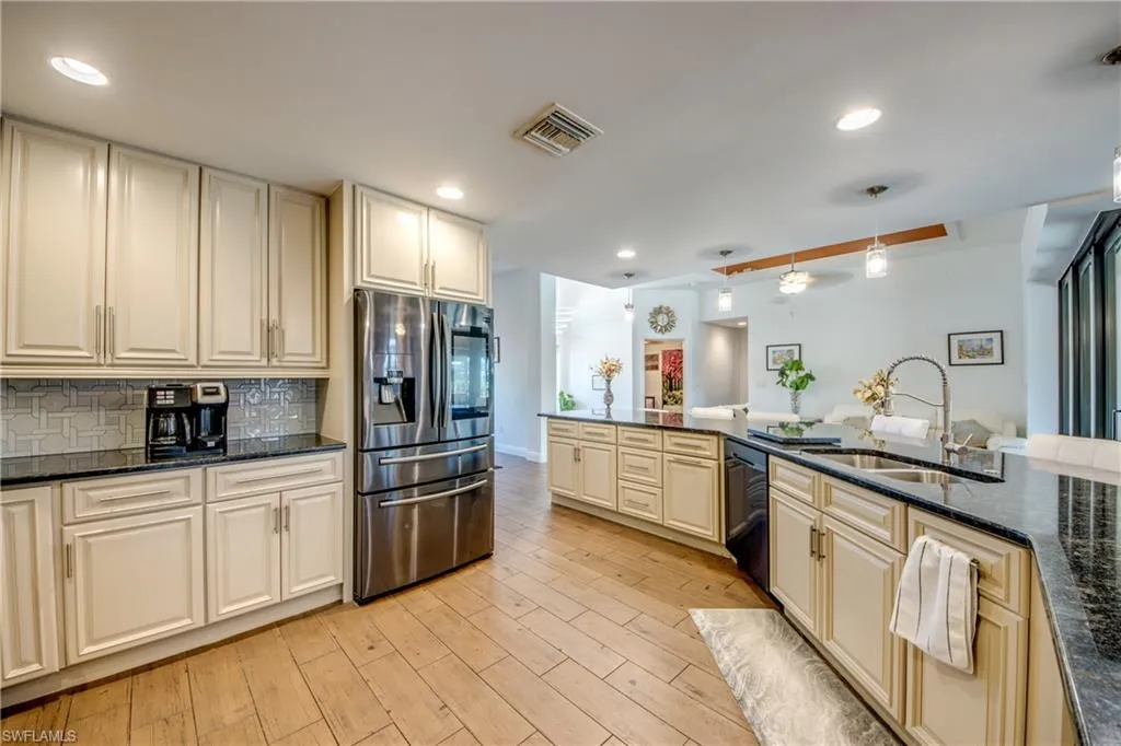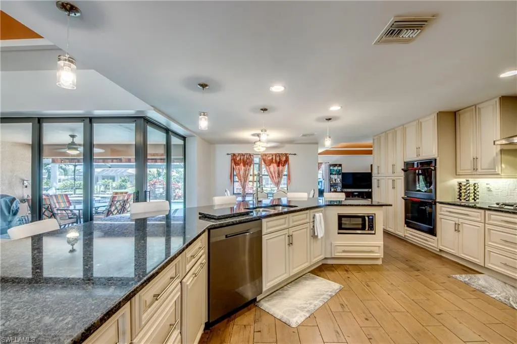 Additionally, you can keep your boat right in your backyard equipped with a Dock, 10k boat lift, ready for trips to the Gulf. The home is equipped with hurricane-impact windows and doors and boasts an open living room with 90-degree sliders that offer stunning views of the intersecting canals and basin.