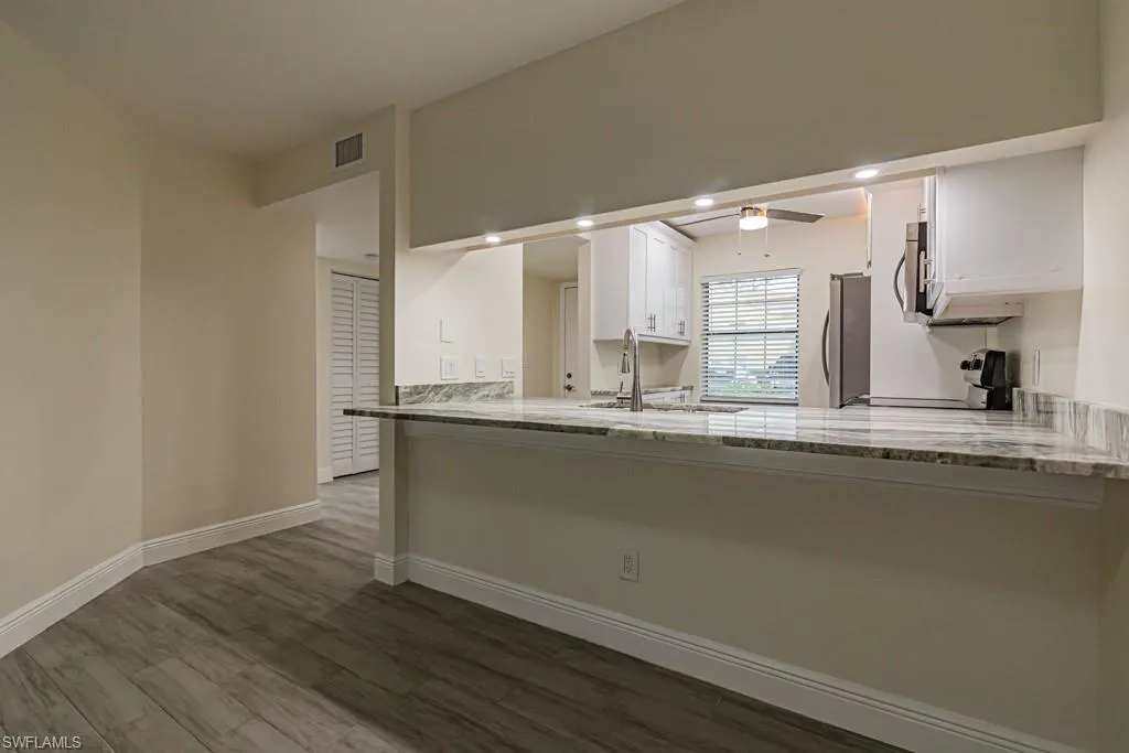 Step into this beautifully updated condo, where style and comfort meet! The stunning kitchen features elegant granite countertops, brand-new stainless-steel appliances, and custom cabinetry, making it a dream for any home chef. The spacious master suite boasts a walk-in closet and a beautifully upgraded ensuite bathroom. 2 beds plus a den. The equally charming second bedroom offers a generous closet and plenty of natural light. The open floor plan seamlessly connects to the tiled, screened-in lanai, where you can relax and take in the serene preserve views. Greenwood Village offers fantastic amenities, including a sparkling community pool and a scenic walking path around the central lake. Conveniently located within walking distance to Publix, Starbucks, and more at King’s Lake Plaza, this home is just minutes from the vibrant heart of downtown Naples. Photos in this listing have been virtually rendered.