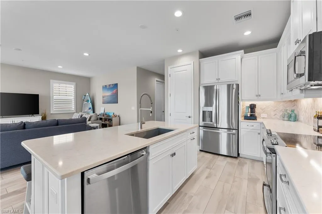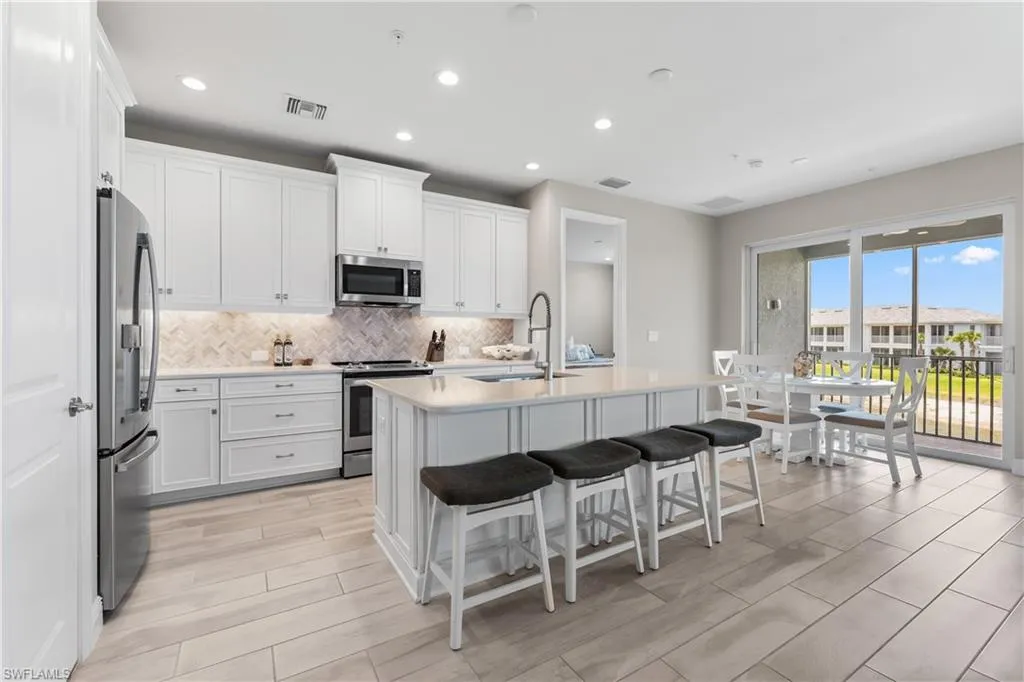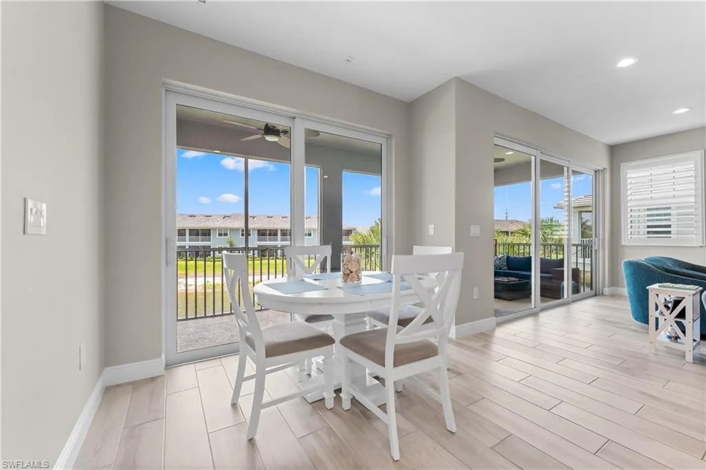 PRICED TO SELL! *South Facing – *Corner Unit – *Lakeview! Built in 2023 by the highly renowned Neal Communities, this condo features a stunning British West Indies design nestled in an amenity rich gated community located just minutes from Downtown Olde Naples. This light and bright open-concept corner unit is conveniently located within walking distance to the community pool and clubhouse and features 2 bedrooms and a large den which can easily be used as a third bedroom. Loaded with luxury features such as hurricane impact doors and windows, plantation shutters, contemporary quartz countertops, white shaker style soft-close cabinets, under mount cabinet lighting, designer backsplash, and premium stainless steel appliances. The spacious master bedroom features a sizable walk-in closet, frameless glass shower, and dual sinks with plenty of undercabinet storage. Enjoy the most sought after light & bright Southern exposure with picturesque sunsets over your long lake view. The centrally located neighborhood of Seychelles features resort-style amenities that cater to your every desire, including a state-of-the-art 4,500 sq ft clubhouse, a stunning resort-style pool and spa, a BBQ area perfect for entertaining, well equipped gym, and a cozy fire pit for evenings under the stars all located only 10 minutes from downtown Naples and 5th Avenue. Schedule your private tour today!