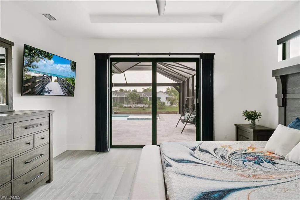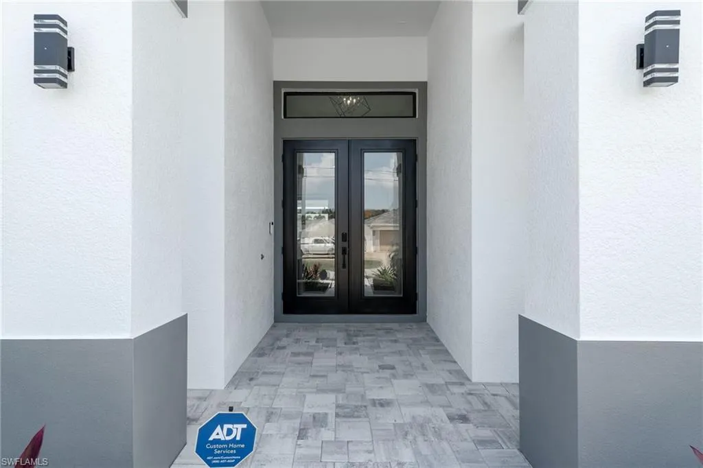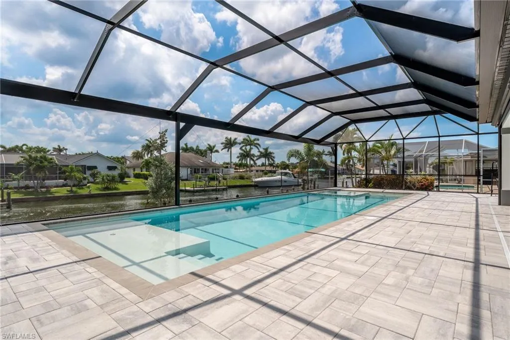 Welcome to PARADISE!! Brand New Construction home finished in 2025. Situated in the prime area of Southwest Cape Coral, this home offers an exceptional location. As you enter into the foyer it has 12’8 ft ceiling which welcomes you into this expansive open floor concept accompanied by a 3 Tier sliding glass pocket doors that allow for seamless indoor-outdoor living. Luxury plank tile floors flow throughout, ensuring a stylish environment. While every detail harmonizes for an eye-catching, cohesive design. Custom tray ceilings in the living area that are 10’4 ft as well as primary bedroom. The primary bedroom offers direct lanai access, and the spa-like primary bathroom features a huge walk-in shower with dual showerheads, dual sinks, and a spacious walk-in closet. Two additional guest bedrooms, one with an ensuite bathroom leading to the pool area, plus a versatile den. Kitchen features stainless steel appliances, walk-in pantry with Bentley granite countertops thought-out. The expansive living area opens directly to an oversized patio, hosting an electrically heated salt-water pool and spa with 8×6 ft. sunshelf and bench seating along the entire side of pool. The pool is set up for volleyball, so the middle is deeper than the ends for those endless fun in the sun pool days. The panorama screens offer unobstructed views, ensuring that you are never more than a glance away from serenity. An outdoor kitchen with a built-in grill, sink and refrigerator, and a serene waterfront backdrop that amplifies the beauty of Paradise! This home also includes a tile roof, with sprayed insulation, impact-rated windows and doors for peace of mind. Extra-wide electric roll-down shutters for effortless lanai protection. The brand-new seawall was raised 2ft. Room for your boat dock on the most desirable direct access Glorianna Canal. Amenities like Camelot Park with lighted tennis and pickleball courts, walking trails, a playground, and picnic shelters. Just a short stroll to some of the finest dining establishments like Cape Harbour Marina, Tarpon Point Marina, Lobster Lady, Prime 239, Ceno’s, Overtime Pizzaria and the beaches of the Yacht Club in Cape Coral, Sanibel and Fort Myers. Walking distance to Publix, Banks, public transportation and post office. Schedule your private showing today!