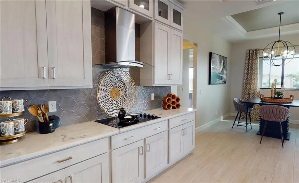 trays/coffers/grids, designer fixtures, 5″ baseboards, master dual vanity, tiled showers, pool bath and walk-in closet. Moments away from