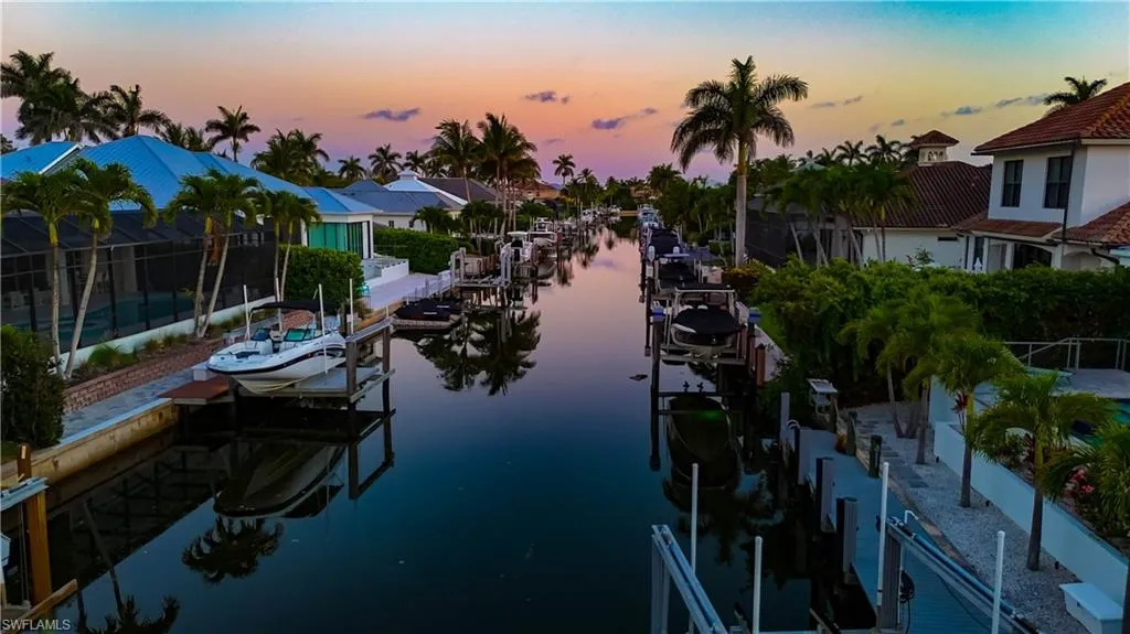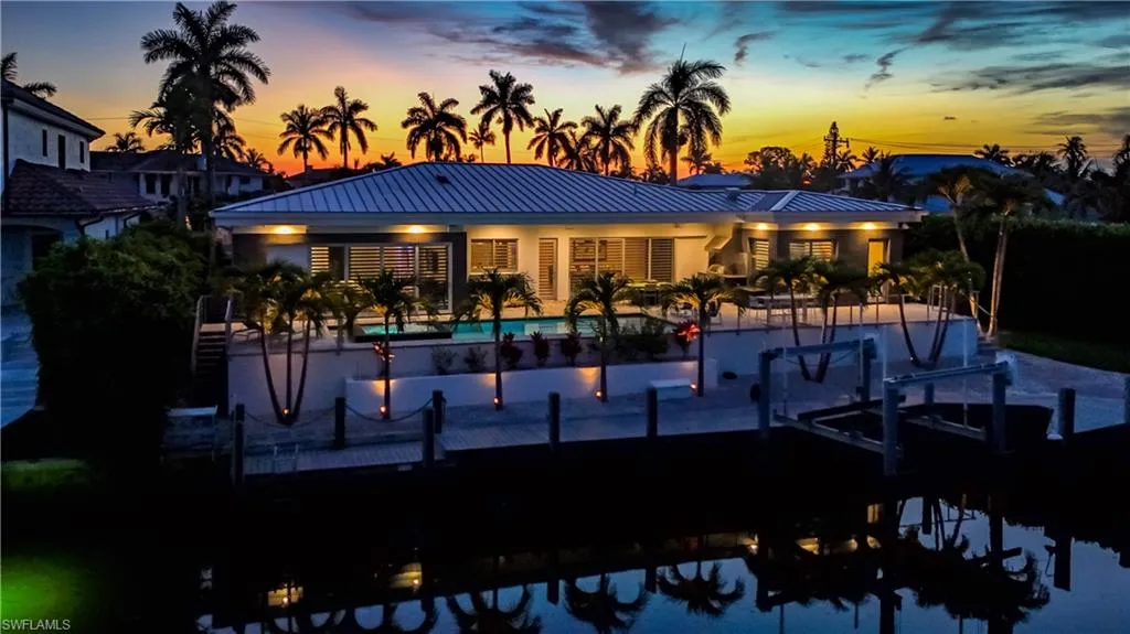 Situated in the prestigious boating community of Royal Harbor, this stunning residence sits on an oversized corner lot along a wide navigable waterway with direct Gulf access. Boasting a private dock with a 10,000 lb lift accommodating up to a 32-foot vessel, the home offers 4 bedrooms, 3.5 baths, and 3,339 square feet of luxurious living space. The open-concept floor plan is ideal for entertaining, with a spacious great room that flows seamlessly into the lanai and a gourmet kitchen featuring high-end finishes, Bosch electric cooktop, Sub-Zero refrigerator, wine refrigeration, separate wet bar, large island with quartz countertops, and custom cabinetry by Hyland. The primary suite is a true retreat with dual walk-in closets, an oversized walk-in shower with multiple heads, dual sinks, and a separate soaking tub. The outdoor living space is a private oasis, complete with a sparkling pool and spa, sun shelf, outdoor kitchen, wet bar, fire pit, and multiple seating areas perfect for relaxing or hosting guests. Additional features include impact windows and doors, an oversized two-car garage, EV charger, and generator hookup. Ideally located just minutes from the heart of downtown Naples, residents can indulge in world-class shopping and fine dining along 5th Avenue South and 3rd Street, as well as enjoy the sugar-sand beaches and vibrant cultural offerings that define the Naples lifestyle.