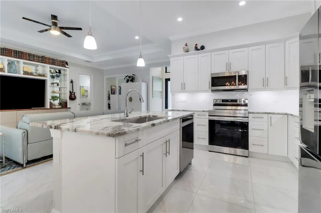 As you step inside, you’ll be captivated by the meticulous attention to detail and modern finishes that define this residence. The elegant glass white tile flooring creates a seamless flow throughout the home, while impact windows enhance energy efficiency and provide peace of mind. Enjoy year-round comfort with ceiling fans in every room, including the den.