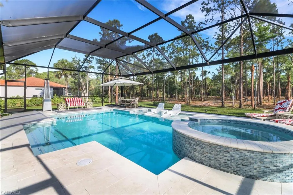Your private backyard oasis awaits, featuring a self-filling saltwater pool and spa, all under a spacious screened cage (45’x31’) with rear picture window. The travertine deck is perfect for entertaining or unwinding in the glorious Florida sunshine. Plus, control your pool settings right from your phone, including ambient evening lighting for those magical nights.