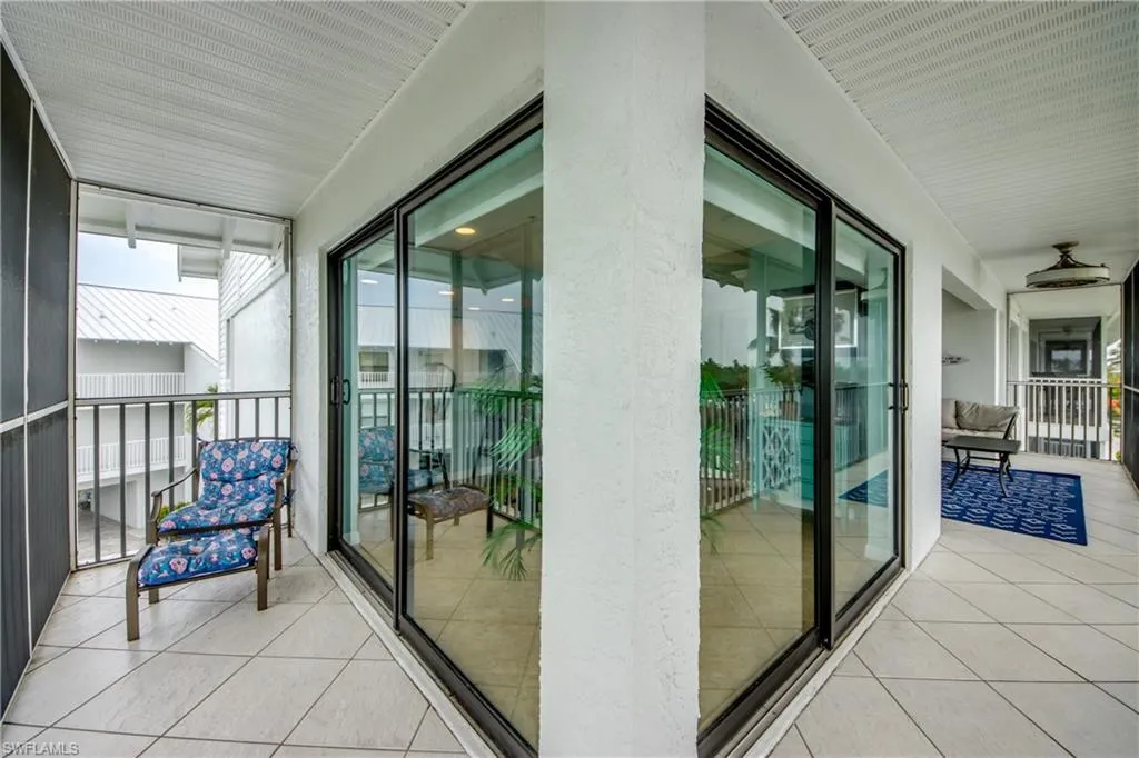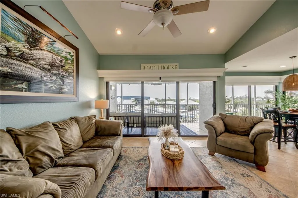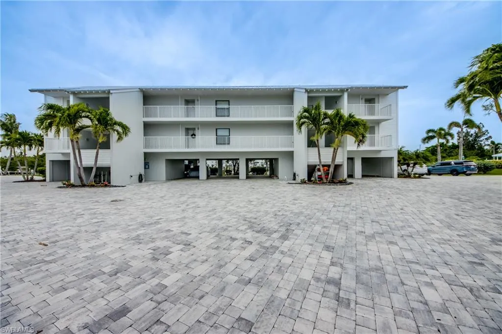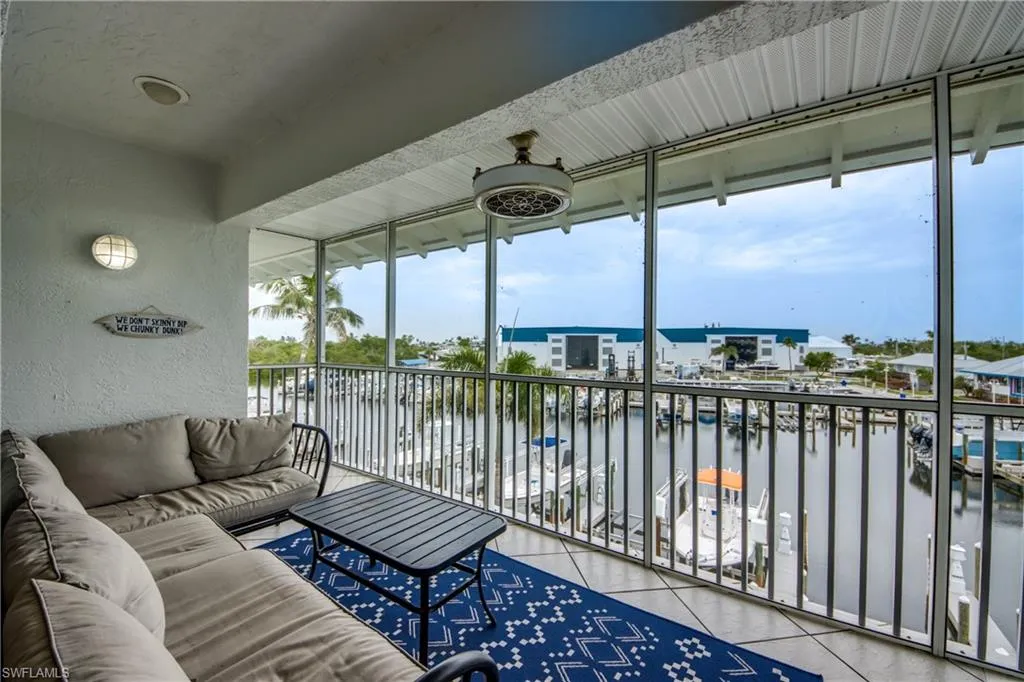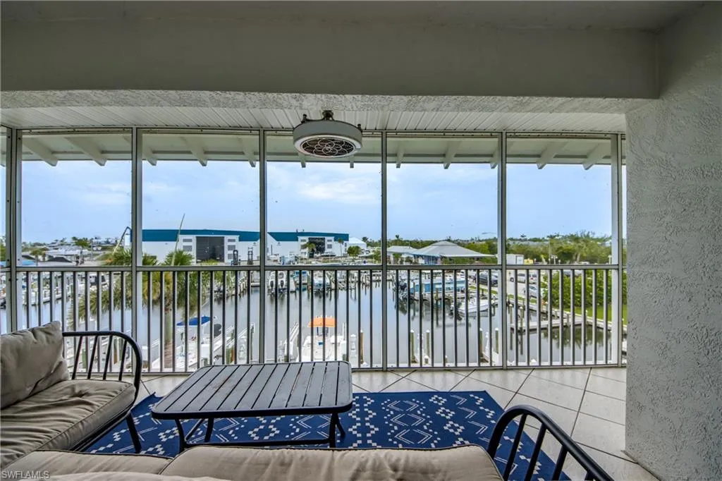 This a beautiful top floor end-unit condo overlooking Four Winds Marina and Jug Creek. The kitchen is bright white with wooden cabinets and solid surface countertops. Kitchen pantry and large laundry room with many white cabinets over the washer/dryer. All impact windows and doors. Plantation shutters though out and privacy screens on the sliders. This beautifully decorated condo is being sold turnkey, so just bring your clothes and fishing gear and start living the island lifestyle that Pine Island has to offer. All of the buildings in the Four Winds Marina Condo complex are concrete/stucco (not wood pilings or wood construction. All new metal roofs installed in 2022. On site full service marina and seafood restaurant. All pavered entry and parking. Bokeelia is truly one of the most beautiful areas of Pine Island. Bring your boat for leased storage at the on-site marina. There are also many fishing charters located at the marina for fishing the flats or offshore in the Gulf of America. 24-hour patrolled security on the premises.