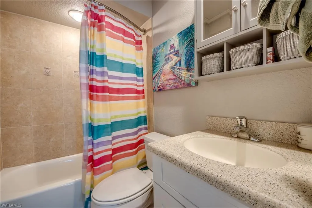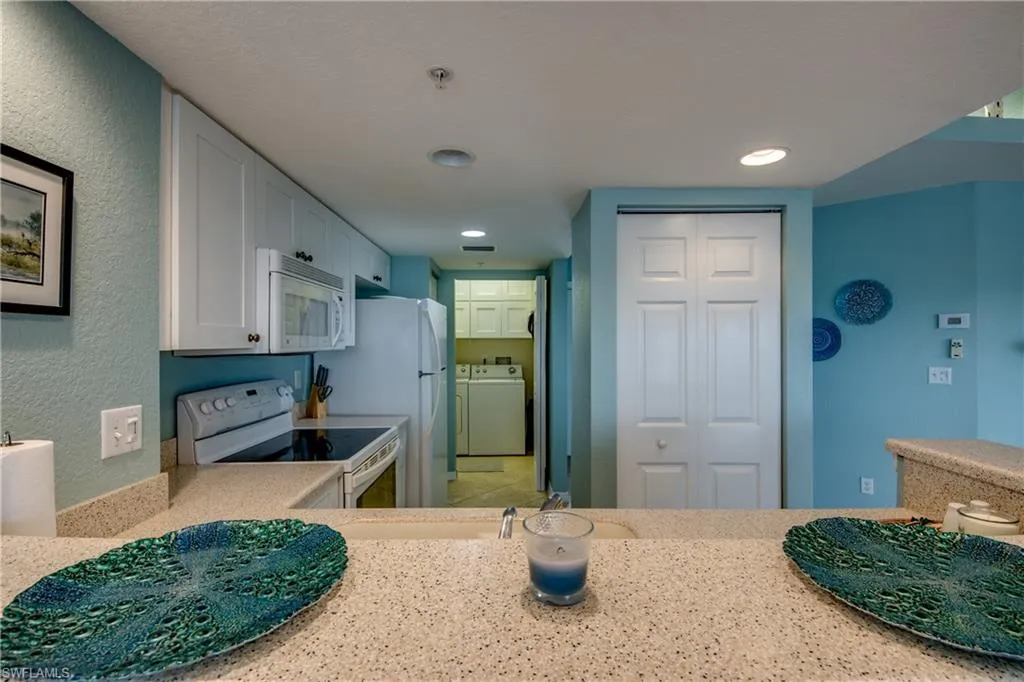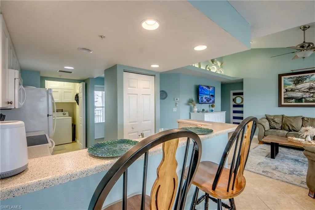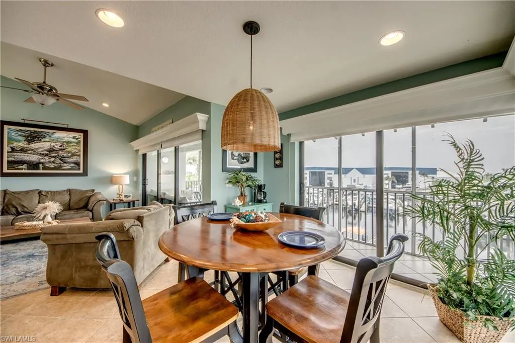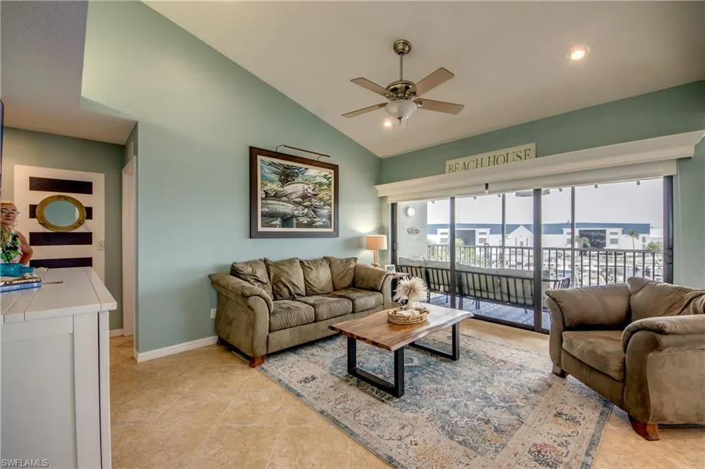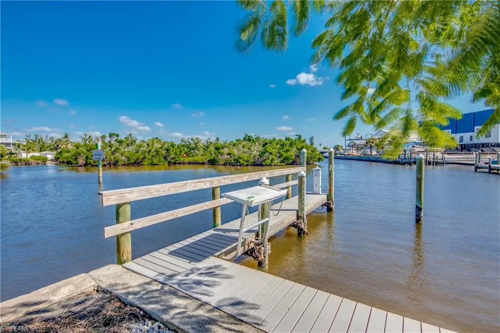 This a beautiful top floor end-unit condo overlooking Four Winds Marina and Jug Creek. The kitchen is bright white with wooden cabinets and solid surface countertops. Kitchen pantry and large laundry room with many white cabinets over the washer/dryer. All impact windows and doors. Plantation shutters though out and privacy screens on the sliders. This beautifully decorated condo is being sold turnkey, so just bring your clothes and fishing gear and start living the island lifestyle that Pine Island has to offer. All of the buildings in the Four Winds Marina Condo complex are concrete/stucco (not wood pilings or wood construction. All new metal roofs installed in 2022. On site full service marina and seafood restaurant. All pavered entry and parking. Bokeelia is truly one of the most beautiful areas of Pine Island. Bring your boat for leased storage at the on-site marina. There are also many fishing charters located at the marina for fishing the flats or offshore in the Gulf of America. 24-hour patrolled security on the premises.