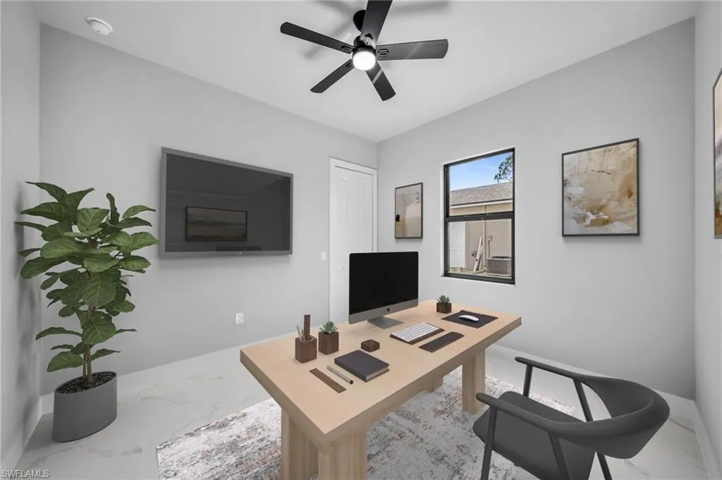 Location, Location, Location! Brand new construction with modern finishes, this beautifully designed 3 Bedroom + Den, 2 Bath home offers 1,603 sq ft of living space and a 2-car garage. Featuring sleek tile flooring throughout, high ceilings, and an open floor plan, this home is perfect for comfortable living and entertaining. The contemporary kitchen includes acrylic cabinets, elegant quartz countertops, and stainless-steel appliances. Bathrooms are equally impressive with floating vanities and matching upscale finishes. The versatile den can serve as a home office, playroom, or fitness space. Located in a desirable area of Lehigh Acres, just minutes from shopping, restaurants, schools, and hospitals—this is the perfect place to call home.