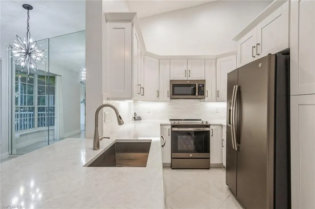 Upon entering, you’re greeted by soaring cathedral ceilings and gleaming white tile floors that extend throughout the main living areas and the screened lanai, creating a bright and airy ambiance. The open-concept layout is ideal for both entertaining and everyday living. The kitchen boasts white cabinetry, a white and light grey backsplash, and white and light grey quartz countertops, providing a sleek and functional culinary space. Complementing the design are GE slate appliances, which offer a smudge-proof, matte finish that harmonizes beautifully with the kitchen’s color palette. The master bedroom features laminate flooring, a walk-in closet with custom white built-in cabinetry, and bright en-suite bathroom with dual sinks, white cabinets, white quartz countertops, and a walk-in shower. The second bedroom also offers laminate flooring, while the third bedroom is adorned with white tiles, making it ideal for guests or a home office. The second bathroom includes a tub, offering a relaxing retreat. Additional highlights of this home include a full-size laundry room with a utility sink, an attached one-car garage, and a whole-home water filtration system. The air conditioning is 3 years old. The screened lanai, featuring white tiles consistent with the rest of the home, offers a beautiful view of the landscaped surroundings, with partial views of the pool and clubhouse, providing a serene outdoor space. The community pool, spa, BBQ facilities, and clubhouse are all within walking distance. Optional membership to The Vineyards Country Club unlocks a world of luxury amenities, including 36 holes of championship golf, 12 Har-Tru tennis courts, 8 Gel-Cushioned pickleball courts, a new 15,000-square-foot Wellness Center & Spa, and a newly renovated 70,000-square-foot clubhouse.