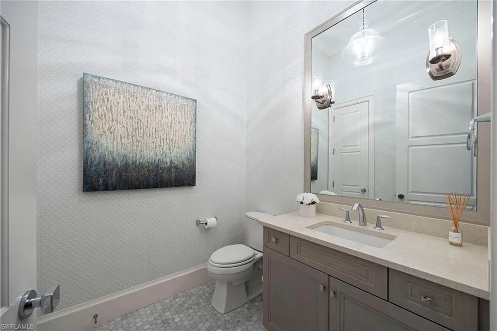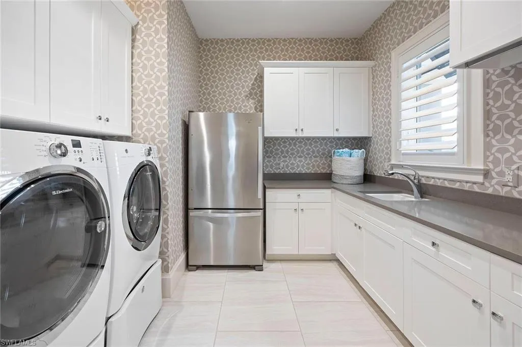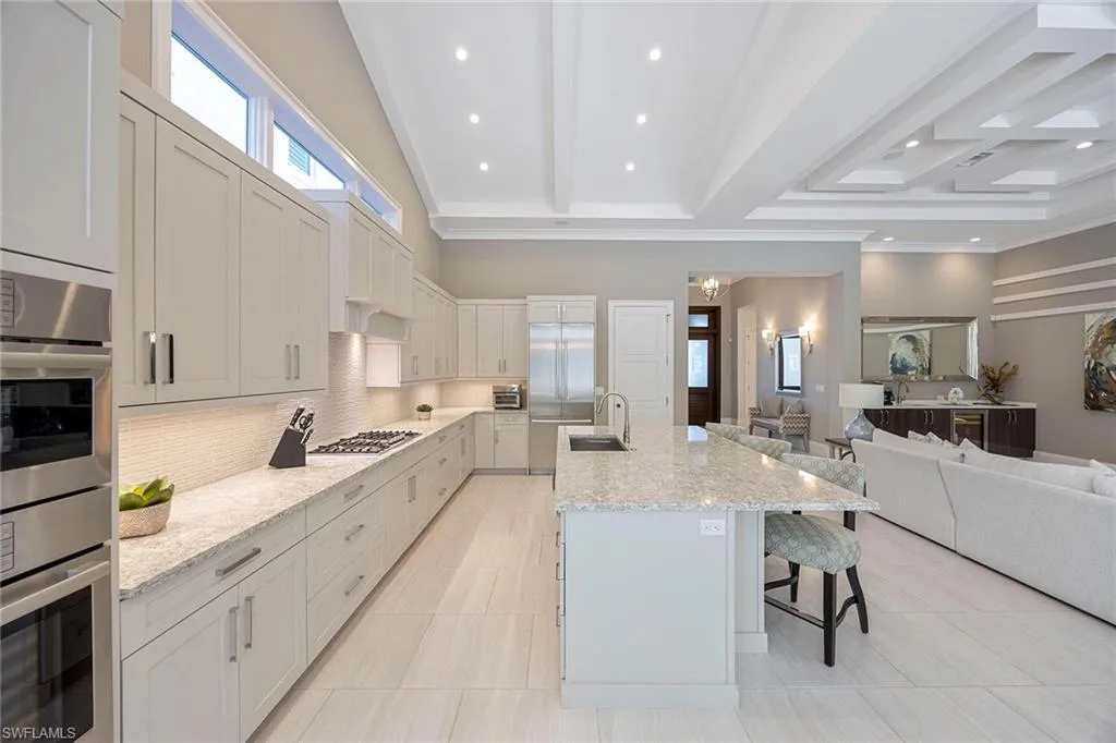 This impeccably maintained, fully furnished former model home—designed by Jinx McDonald Interiors and constructed by award-winning Seagate Development Group—offers a refined blend of craftsmanship and coastal elegance. At 6818 Mangrove Avenue in Naples, this three-bedroom, three-and-a-half-bath residence with a den spans 3,119 square feet under air and 5,268 total square feet. A set of custom double front doors with glass insets introduces the home’s West Indies-influenced design. Inside, the great room features a wet bar with an under-cabinet wine cooler and 10-foot WinDoor pocket sliding glass doors. The gourmet island kitchen includes Bosch appliances, granite and quartz countertops, and Smithport cabinetry. The open dining area is designed for seamless entertaining. The primary suite offers a light-filled retreat with expansive windows and a seating area, a freestanding soaking tub, frameless shower, and custom closet system. Interior enhancements include a Control4 home automation system, premium wood baseboards, solid Timberland doors, Emtek hardware, sound insulation in baths and laundry, and level 5 drywall. The home includes valuable features such as a whole-house water softener, plantation shutters and a whole-house generator. It is offered turnkey furnished—just move right in and enjoy. Outdoor living is elevated with a custom pool, spa and summer kitchen surrounded by a professionally landscaped setting with lighting. The three-car garage includes epoxy flooring. Set in one of Naples desirable areas, the home provides convenient access to state beach parks, fine dining and luxury shopping. This residence combines model-home quality with enduring construction and thoughtful design.