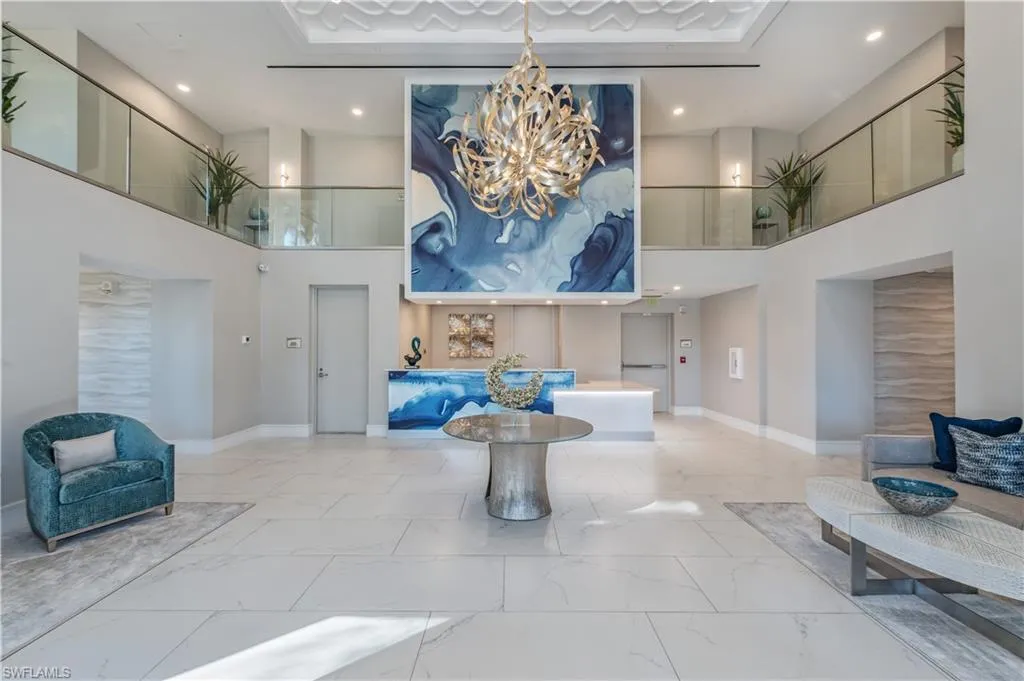and the Gulf of Mexico. Private entry alcove. Dramatic 11 foot ceilings throughout. 3 Bedroom/3 Baths. Open balcony with picturesque views to the West and dramatic sunsets. The second balcony is screened with a built-in grill, perfect for casual outdoor dining and entertaining. Wall coverings are Venetian plaster and soft linen. Travertine/marble floors in main living areas and bamboo wood floors/baseboards in bedrooms. Many high end custom features with a contemporary flair. Offered furnished. Esperia’s special amenities include an oversized resort-style pool and spa with cabana/entertainment area and excellent fitness center–with professional management. Bonita Bay offers a private beach park on the Gulf with free shuttle service, a full-service marina with wet and dry storage, and 12 miles of walking paths through nature. The optional Bonita Bay Club features five 18-hole golf courses, tennis, pickleball, and croquet; also, state-of-the-art fitness center, spa/hair salon, and restaurants. Please don’t miss seeing the photos!