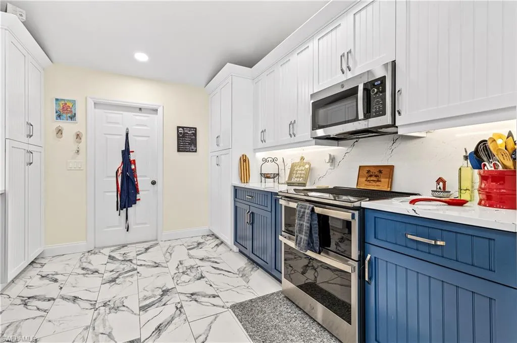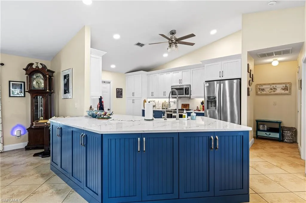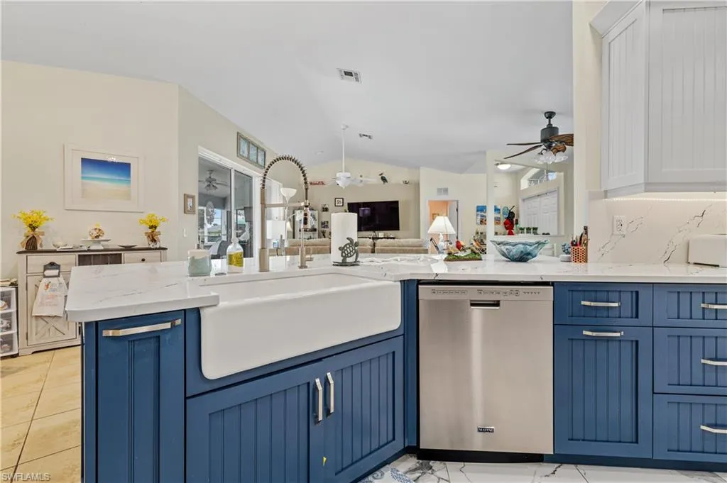 At the heart of the home, the remodeled kitchen is a showstopper. Bright white upper cabinets pair perfectly with slate blue lowers, creating a fresh coastal look. Quartz countertops, marble-look tile flooring, a spacious island for prep and gathering, stainless steel appliances, a farmhouse sink, under-cabinet lighting, and beadboard cabinetry complete this chef-inspired space. The open great room floor plan is enhanced by soaring cathedral ceilings, tile floors throughout, a formal dining area, and a sunny breakfast nook—ideal for both entertaining and everyday living.