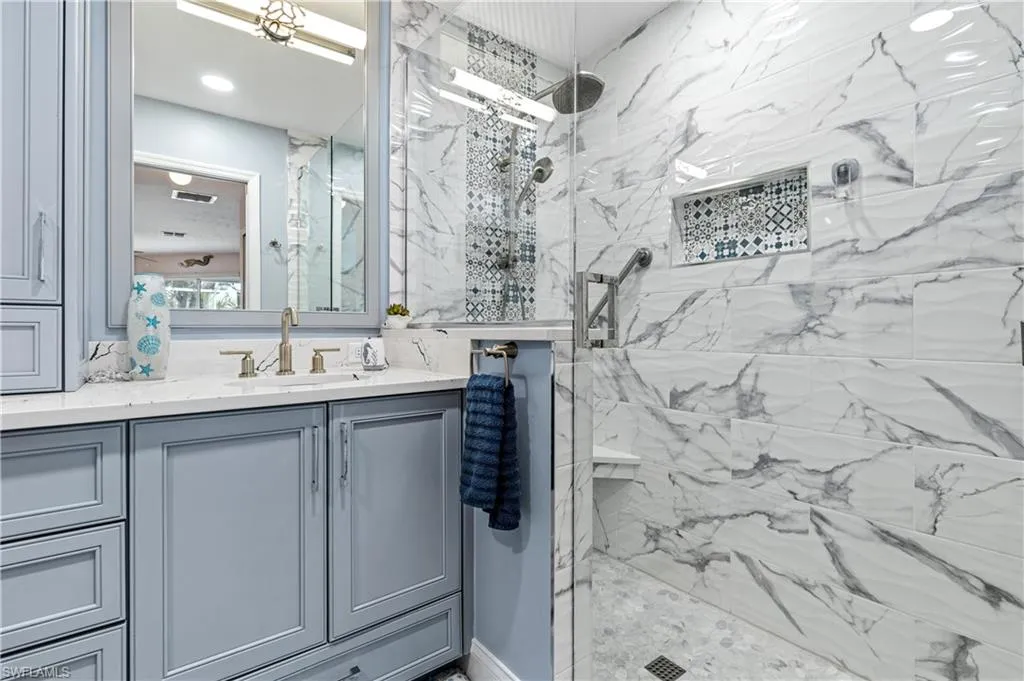 The master suite is a private retreat, featuring sliding doors to the lanai, a generous walk-in closet, and a beautifully renovated bath with dual sinks, designer cabinetry, and a custom-tiled walk-in shower. Two inviting guest bedrooms share an updated guest and pool bath, making the home perfectly suited for family or visitors.
