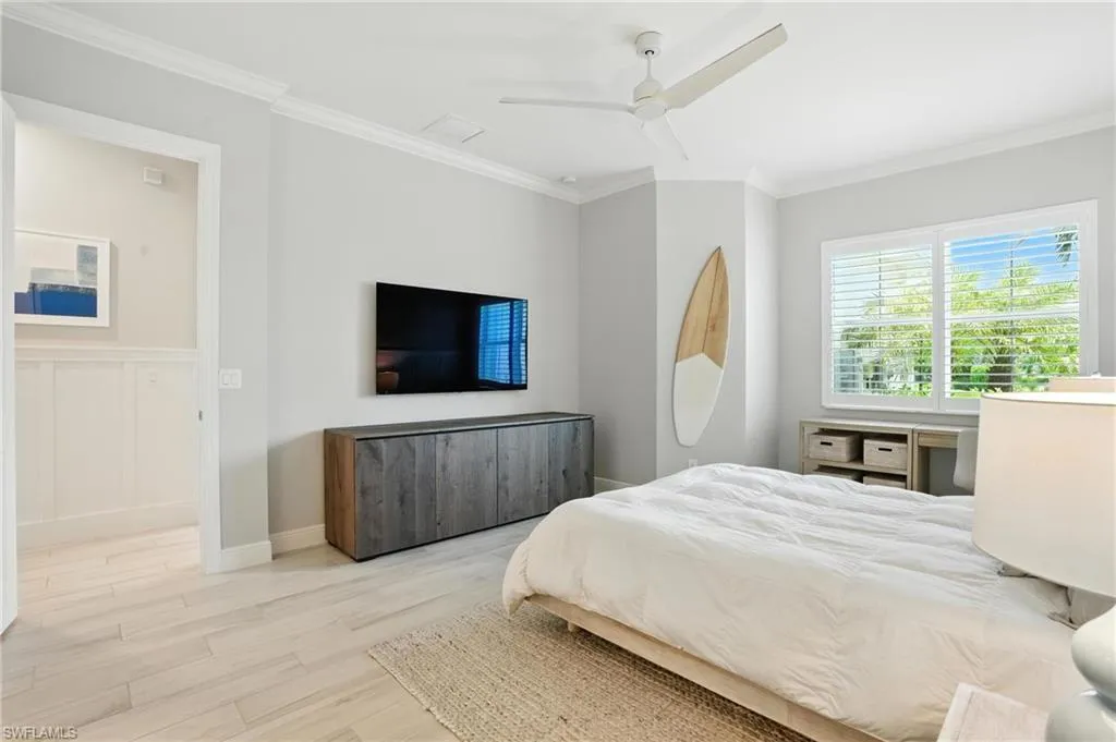 Welcome to effortless Florida living in the gated community of Azure at Hacienda Lakes. This beautifully maintained 2-bedroom, 2-bath home offers 1,645 square feet of thoughtfully designed living space and is being sold fully furnished with high-end pieces from Pottery Barn and West Elm. Step inside to find wall-to-wall tile flooring, detailed crown molding and wainscoting, and a neutral palette freshly repainted throughout. The open-concept layout flows seamlessly to a covered lanai overlooking a tranquil lake—your personal backdrop for morning coffee or evening relaxation. Both the primary and guest bedrooms feature custom-built walk-in closets, thoughtfully designed and ready for your clothes, shoes, and accessories. Additional storage upgrades include a built-in hallway pantry and generous cabinetry in the laundry room, which is also pre-plumbed for a utility sink.