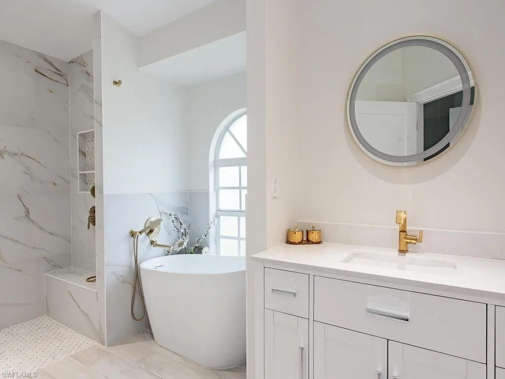 The master bedroom is a true retreat, featuring a luxurious freestanding soaking tub and a modern walk-in shower, ensuring your personal oasis for relaxation. Step outside into the screened lanai, where you can unwind by the inviting pool sunny pool, ideal for soaking up the sun or enjoying a refreshing swim.