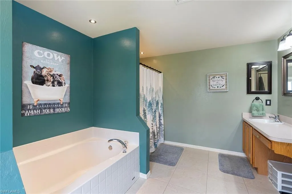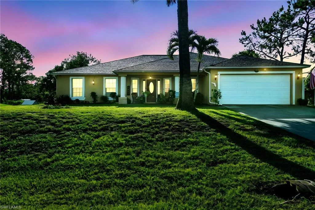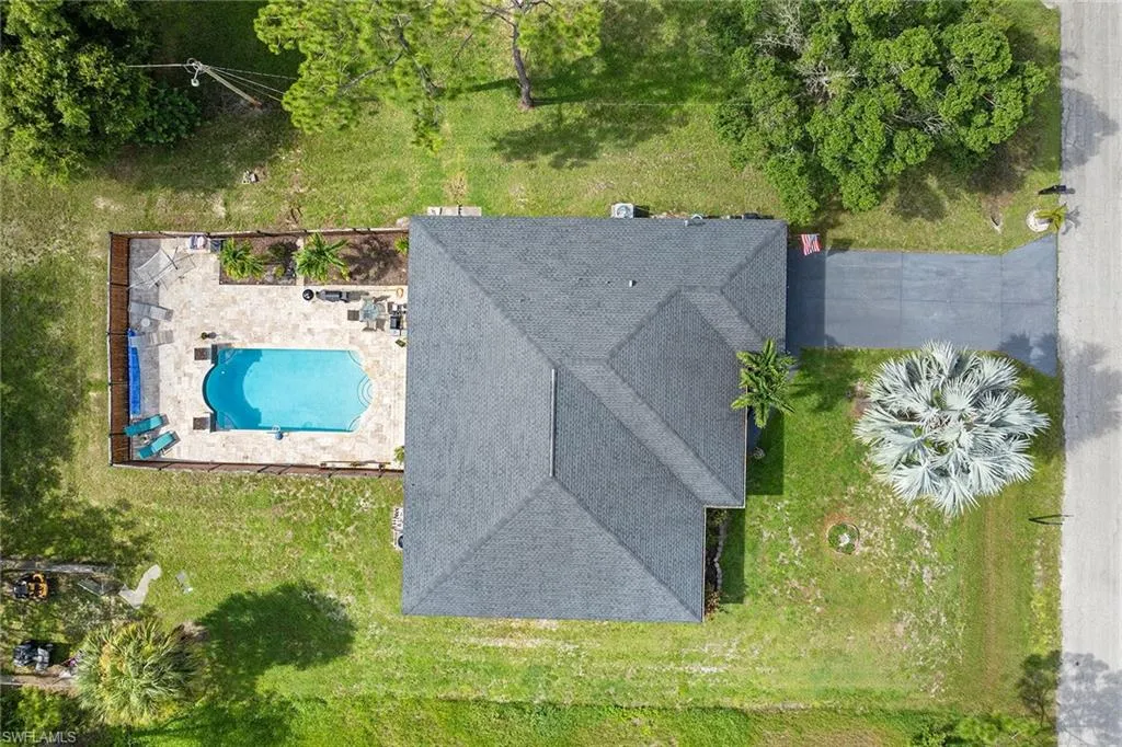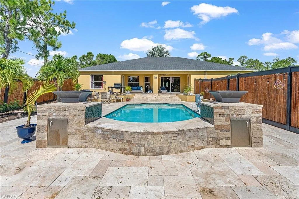 Spacious living, endless outdoor enjoyment and total freedom come together on a rare half-acre lot in one of Lehigh Acres’ fastest-growing communities. This beautifully maintained four-bedroom, two-bath residence is designed for those who crave space, privacy and flexibility. With no HOA fees, a 2019 roof, and no pet restrictions, you can make this property your own. Inside, the well-planned layout offers formal and casual dining areas, a welcoming family room and a flexible den, ideal for an office, playroom or media room. The fully fenced expansive lanai serves as a private retreat, featuring a large pool that anchors the space, a pool bath for added convenience, and is surrounded by plenty of room for sunbathing, lounging or gathering with friends and family. A covered area offers a shaded spot for outdoor dining or quiet afternoons. As the sun goes down, the decorative fire features cast a warm, inviting glow, creating a backdrop for evening get-togethers. For those who enjoy gardening, a dedicated garden space provides the opportunity to grow fresh herbs, vegetables or flowers, adding charm and a connection to nature to this peaceful setting. All of this is tucked away in a quiet yet rapidly growing part of Lehigh Acres, where residents enjoy the charm of country living with easy access to nearby conveniences. A bonus, the flood insurance policy is transferable to the new owner for an affordable monthly premium of just $45. If you’ve been dreaming of a spacious, private retreat with room to entertain, play and relax—without burden of HOA rules—this is the property you’ve been waiting for.