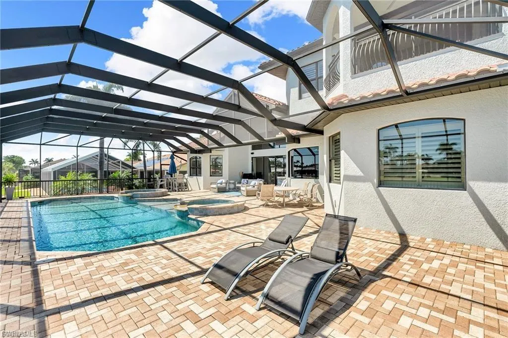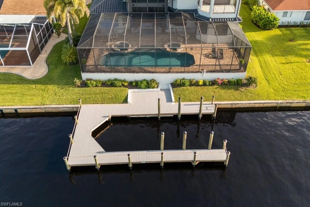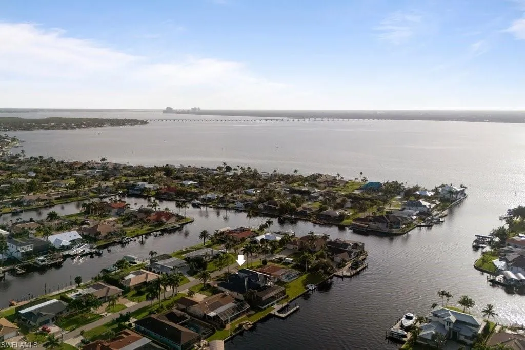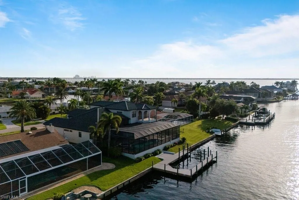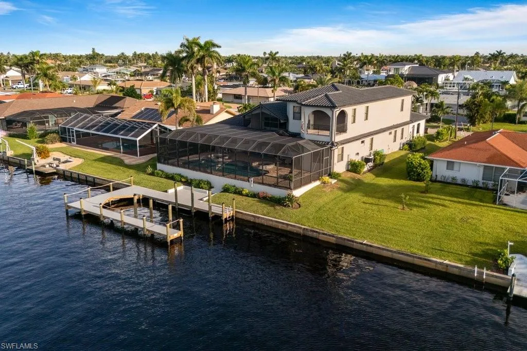 Experience the pinnacle of Southwest Florida living in this luxury Cape Coral waterfront estate, transformed into a nearly new residence with over 4,700 sq ft of air-conditioned space and more than 5,200 sq ft under roof. Blending timeless Mediterranean architecture with modern sophistication, this two-story home sits on an oversized lot along a 200-foot-wide intersecting canal, offering direct, no-bridge sailboat access to the Caloosahatchee River and Gulf of Mexico in minutes. Designed for the most discerning buyer, this residence delivers unmatched location, craftsmanship, and lifestyle. The seller has invested over one million dollars in upgrades, including a BRAND NEW metal roof, brand-new boat dock, Captains Walk, and new electrical panel completed within the last two months. Inside, marble and luxury vinyl wood-plank floors complement soaring tray and vaulted ceilings, with walls of impact glass framing sweeping waterfront views. The chef’s kitchen features a smart double oven, cooktop, oversized island, wine cooler, and breakfast bar ideal for entertaining. The nearly 1,000-sq-ft main-level owner’s retreat includes a spacious bedroom, private study, and spa-inspired bath with dual vanities, a jetted soaking tub, and a walk-through shower overlooking the water. Upstairs, a private suite offers its own living room, wet bar, and balcony with stunning canal and river views, perfect for guests or multi-generational living. The outdoor living space is resort-inspired, showcasing two elevated spas cascading into a heated pool, expansive sun decks, a full outdoor kitchen, and multiple areas for dining and lounging. Southern exposure ensures all-day sun and panoramic sunrise and sunset views. Additional highlights include impact-resistant doors and windows, lush landscaping, and no HOA restrictions. With direct Gulf access, this estate is ideal for avid boaters and anyone seeking a prestigious retreat in one of Cape Coral’s most desirable waterfront corridors. This property is more than a home—it is a rare opportunity to own a true Southwest Florida sanctuary where every day feels like a waterfront escape.