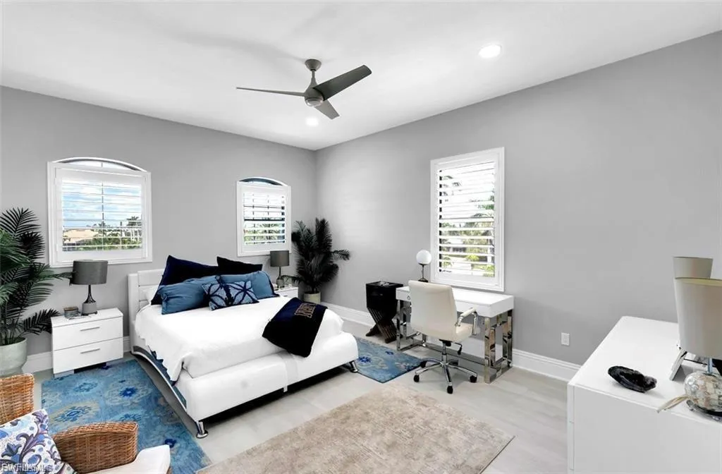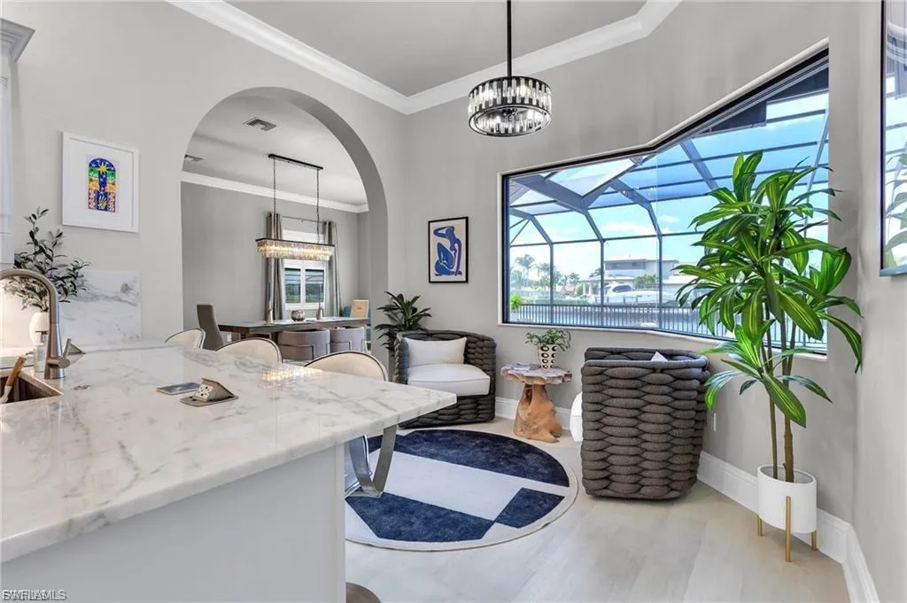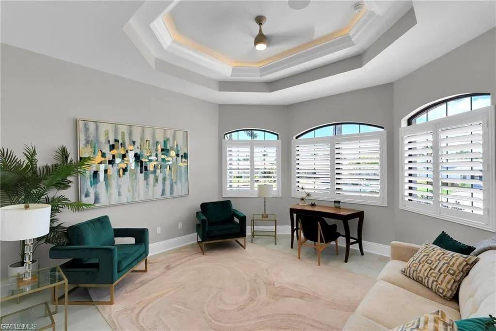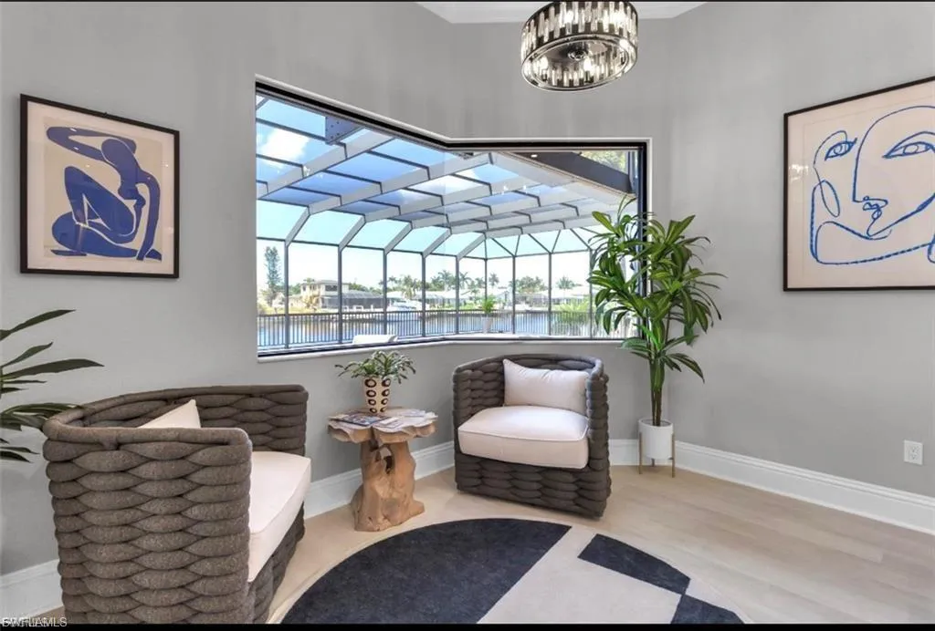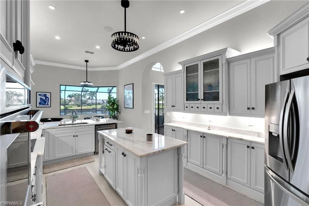 Experience the pinnacle of Southwest Florida living in this luxury Cape Coral waterfront estate, transformed into a nearly new residence with over 4,700 sq ft of air-conditioned space and more than 5,200 sq ft under roof. Blending timeless Mediterranean architecture with modern sophistication, this two-story home sits on an oversized lot along a 200-foot-wide intersecting canal, offering direct, no-bridge sailboat access to the Caloosahatchee River and Gulf of Mexico in minutes. Designed for the most discerning buyer, this residence delivers unmatched location, craftsmanship, and lifestyle. The seller has invested over one million dollars in upgrades, including a BRAND NEW metal roof, brand-new boat dock, Captains Walk, and new electrical panel completed within the last two months. Inside, marble and luxury vinyl wood-plank floors complement soaring tray and vaulted ceilings, with walls of impact glass framing sweeping waterfront views. The chef’s kitchen features a smart double oven, cooktop, oversized island, wine cooler, and breakfast bar ideal for entertaining. The nearly 1,000-sq-ft main-level owner’s retreat includes a spacious bedroom, private study, and spa-inspired bath with dual vanities, a jetted soaking tub, and a walk-through shower overlooking the water. Upstairs, a private suite offers its own living room, wet bar, and balcony with stunning canal and river views, perfect for guests or multi-generational living. The outdoor living space is resort-inspired, showcasing two elevated spas cascading into a heated pool, expansive sun decks, a full outdoor kitchen, and multiple areas for dining and lounging. Southern exposure ensures all-day sun and panoramic sunrise and sunset views. Additional highlights include impact-resistant doors and windows, lush landscaping, and no HOA restrictions. With direct Gulf access, this estate is ideal for avid boaters and anyone seeking a prestigious retreat in one of Cape Coral’s most desirable waterfront corridors. This property is more than a home—it is a rare opportunity to own a true Southwest Florida sanctuary where every day feels like a waterfront escape.