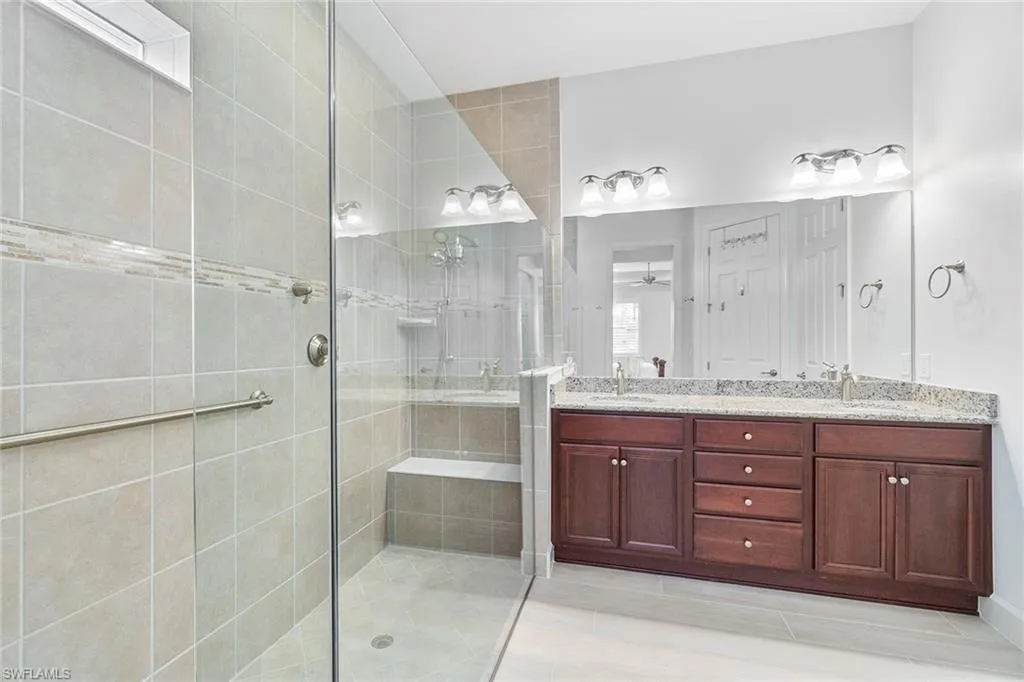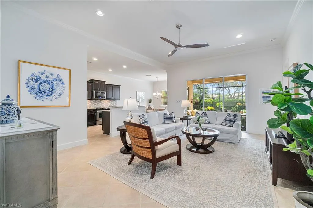 Outstanding value—listed well below appraisal value on a highly sought-after private corner lot! Nestled behind lush tropical landscaping, this beautifully updated two-bedroom plus den, two-bath residence offers everyday luxury in a true resort-style setting. The flexible den, easily converted into a third bedroom, adds versatility to the floor plan. Start your mornings with breathtaking sunrises from the east-facing, expanded lanai, complete with a saltwater pool, spa, and newly installed heater for year-round enjoyment. The professionally landscaped yard, with manicured gardens and privacy hedges, provides a serene backdrop with no homes across the street. Inside, the freshly painted interior features tile flooring in the main living areas and matching luxury vinyl in the bedrooms and den for a cohesive, modern aesthetic. Soaring 11- and 12-foot ceilings in the main living spaces are highlighted by elegant crown molding. The chef’s kitchen is a standout, featuring granite countertops, a stunning glass-and-tile backsplash, soft-close drawers, under-cabinet lighting, and a center island with breakfast bar. A spacious eat-in area overlooks the private pool oasis. Recent upgrades include a new stainless-steel refrigerator and dishwasher. The primary suite is a true retreat, offering dual walk-in closets, a linen closet, private water closet, dual sinks with granite countertops, soft-close drawers, and a luxurious walk-in frameless glass and tile shower with multiple shower heads. Additional highlights include a newer air conditioner (2021), new washer and dryer, and a generous two-car garage with built-in storage racks. Impact-resistant front windows, hurricane screens, and accordion shutters provide added peace of mind. Designed for both relaxation and recreation, The Quarry is a vibrant, amenity-rich community offering boating, water skiing, and kayaking, along with a resort-style pool, lap pool, state-of-the-art fitness and wellness center, tennis, pickleball, bocce, and on-site dining at the Tiki Bar and Clubhouse. Golfers will appreciate the privately owned Quarry Golf Club, a par-72 championship course designed by Hurdzan and Fry, along with a recently updated clubhouse, grill, and dining rooms. Social and golf memberships are optional, but immediately available! From its serene, private setting and thoughtful upgrades to access to world-class amenities, this house truly checks all the boxes. Don’t miss the chance to claim your slice of the Southwest Florida lifestyle!
