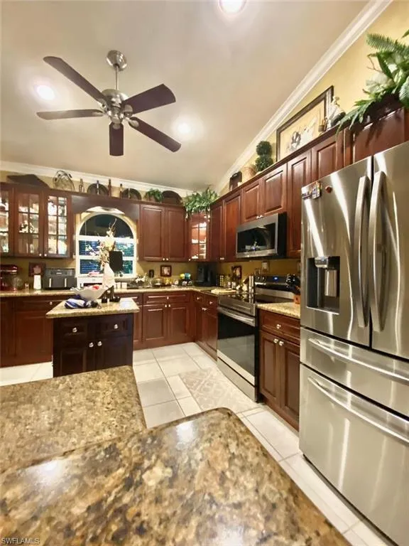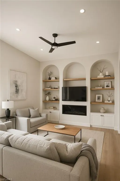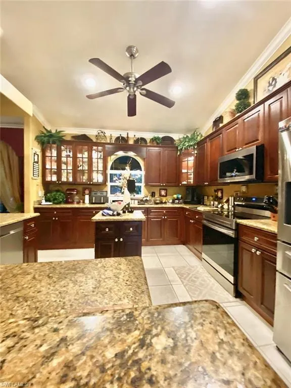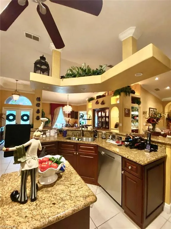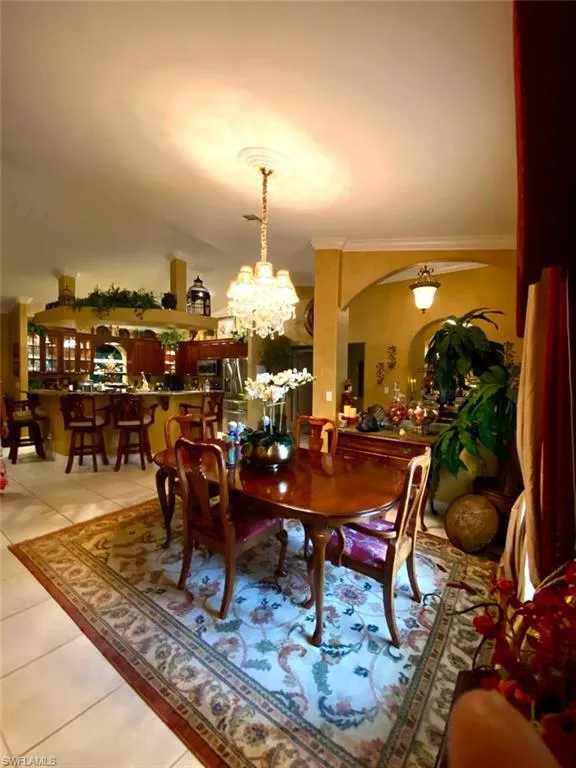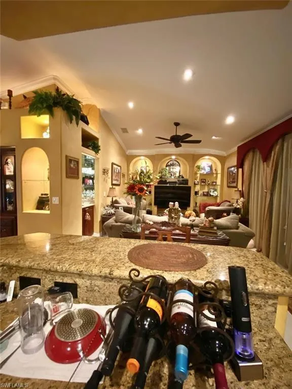 Inside, fine craftsmanship unfolds in every detail. Coffered ceilings, crown molding, and tall baseboards bring depth and refinement to open living spaces. The grand living room, complete with a custom built-in wall unit, ambient lighting, and wet bar, transitions effortlessly through glass sliders to a tiled, screened lanai. Designed for year-round enjoyment, this inviting space lives like an outdoor salon—complete with chandelier, ceiling fan, surround sound, and electric shutters for privacy and comfort.
