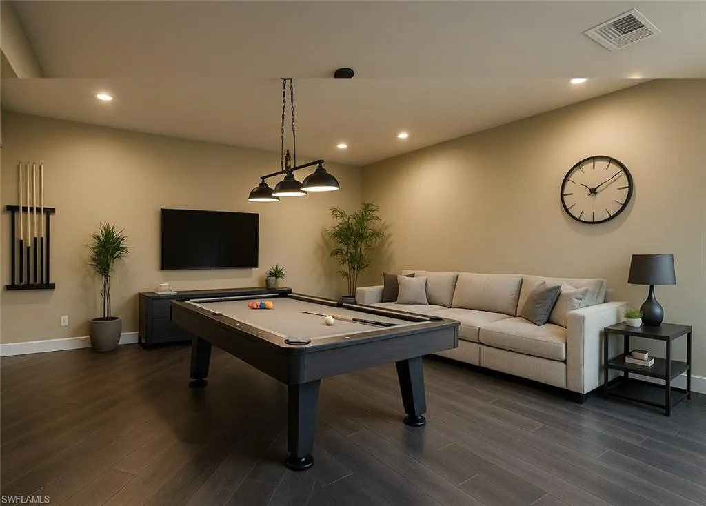 For leisure and entertainment, Bella Vista Estate delivers the ultimate bonus—a fully finished media and game room where the original garage has been transformed into a luxurious social retreat. Complete with tile flooring, a built-in bar, and ample room for your theater seating, billiards table, or game-day gatherings, it’s the perfect escape without ever leaving home.