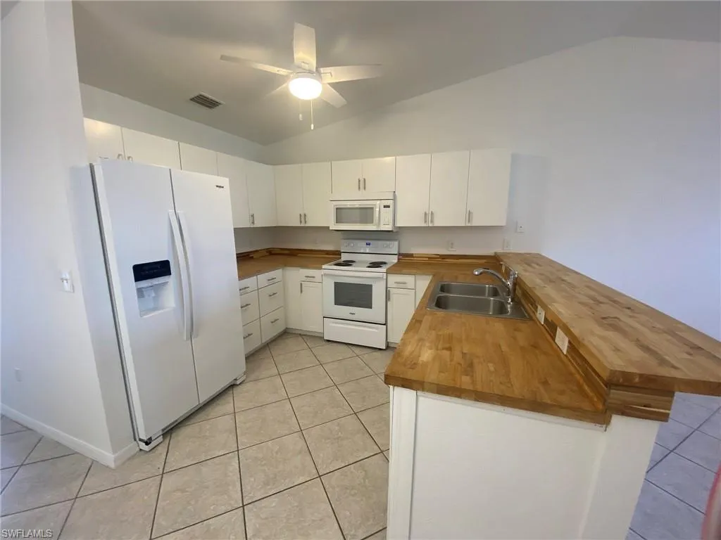 This 3 bedroom, 2 bath, 1 car garage home boasts an open concept with spacious living and dining areas. The Kitchen features a side-by-side Refrigerator, Range, Dishwasher and Microwave with plenty of counter space with Butcher block tops, plus a large breakfast bar. Interior Laundry closet for full sized washer and dryer with storage shelves. The Master bedroom and adjoining bath with walk-in tiled shower. Guest bath has combination tub/shower. Tile and LVP flooring, as well as ceiling fans throughout. Central Cape Coral location with easy access to bus line and major roads. Lawn service included. Last Month’s Rent may be waived with acceptable application and credit scores. Owner may consider one small pet.