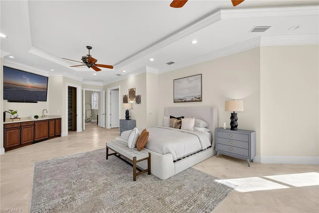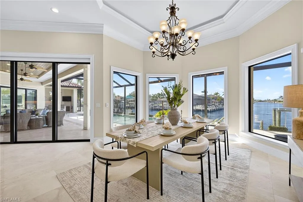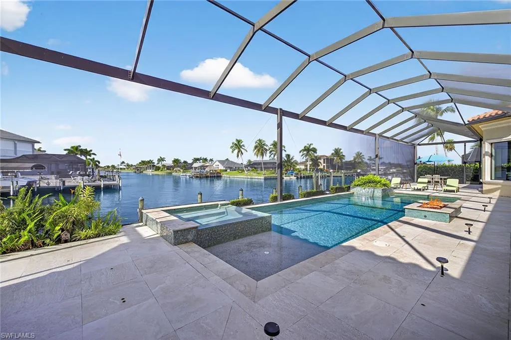 This Gulf-access estate in Cape Coral blends quiet opulence, smart design and breathtaking southern canal views into a distinctive retreat. Positioned on a prime intersecting canal, it features a full-length composite dock and two covered electric boat lifts, each accommodating 24-foot vessels, for seamless Gulf access. Beyond the custom arched, hurricane-rated glass front doors awaits a world of designer upgrades and exceptional craftsmanship. Travertine stone flooring leads to the expansive screened lanai, where a saltwater pool, spa, rebuilt fire pit and outdoor shower create a private retreat. A full outdoor kitchen, with a grill, bar, refrigerator, TV and dining area, sets the stage for unforgettable entertaining. Inside, impact-rated disappearing sliders fill the property with light and open fully to the lanai, blending indoor-outdoor living. Volume ceilings crown the great room, featuring custom built-ins and panoramic canal views. The gourmet kitchen boasts Wolf gas appliances (double ovens, cooktop, warmer), a Sub-Zero refrigerator/freezer, wine cooler, dual marble islands, custom cabinetry and a spacious walk-in pantry. The primary suite offers a private entry, fireplace-lit sitting area, wet bar and three sliders to the pool. Its spa-like bath includes a jetted tub, oversized shower, dual sinks, vanity and a showstopping walk-in closet with center island, shoe closet and makeup station. A VIP-suite, used as an office, includes custom built-ins, an en-suite bath, and is ideal as a second primary for guests or multigenerational living. Additional highlights include a third en-suite bedroom with built-ins, a Jack and Jill setup connecting the third and fourth bedrooms with a walk-in closet and private water closet, and a Murphy bed in the fourth bedroom for added flexibility. Custom cabinetry extends throughout, including the garage, kitchen and baths. The oversized three-bay garage features extra-tall doors, epoxy pebble flooring, and lift-ready height to accommodate up to six vehicles. A new hurricane-rated pool cage, 2023 roof, and impact windows and doors offer peace of mind. Pet lovers will appreciate the laundry room/mud room with sink, storage and shower. Modern conveniences include three-zone air-conditioning plus a garage mini-split, two tankless water heaters, smart locks and a remote-access security system. From curated luxury to unbeatable water access, this exceptional estate delivers the pinnacle of coastal living, with absolutely no compromises.