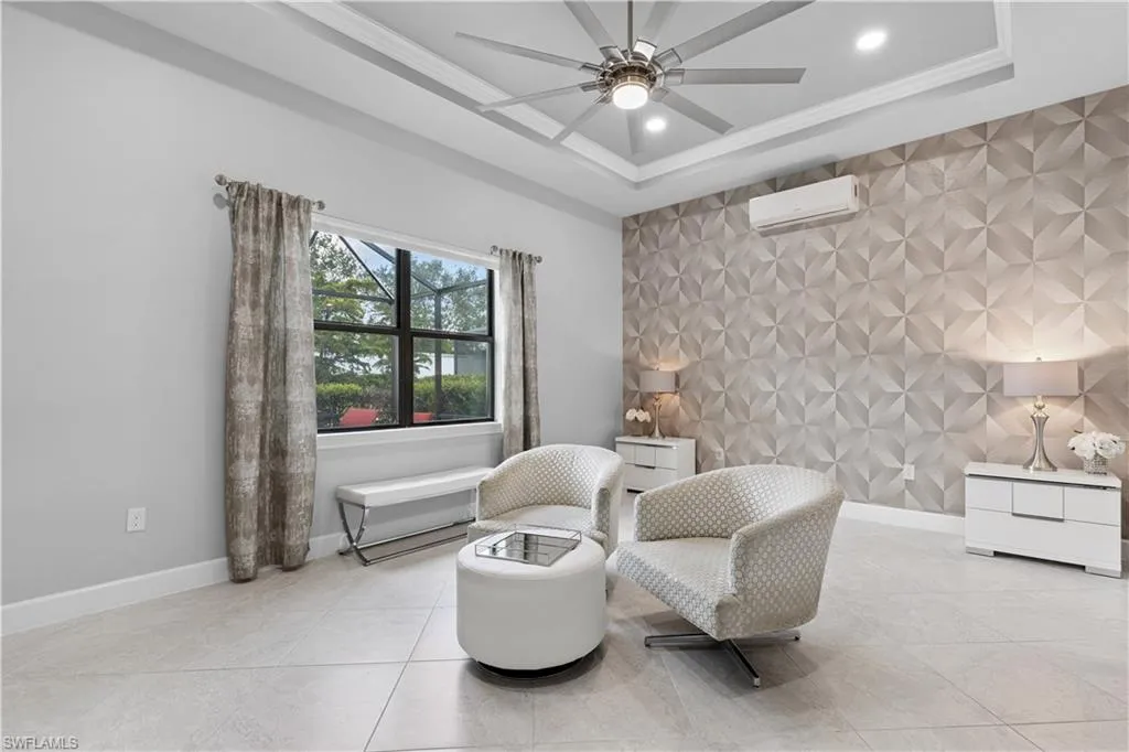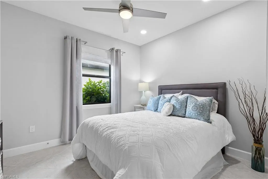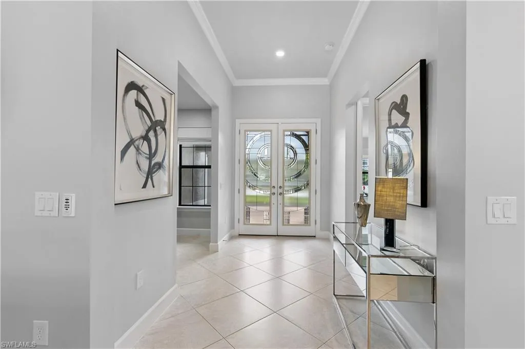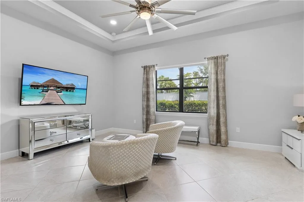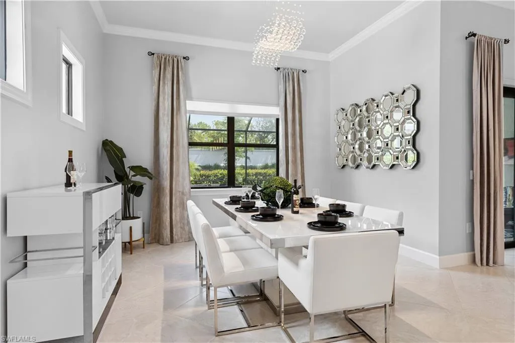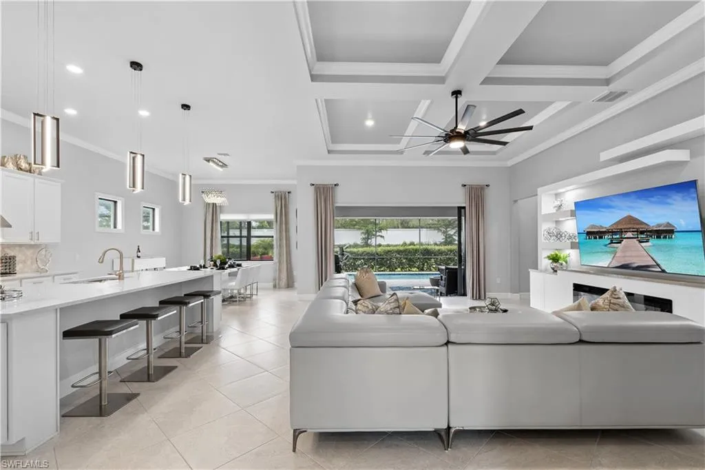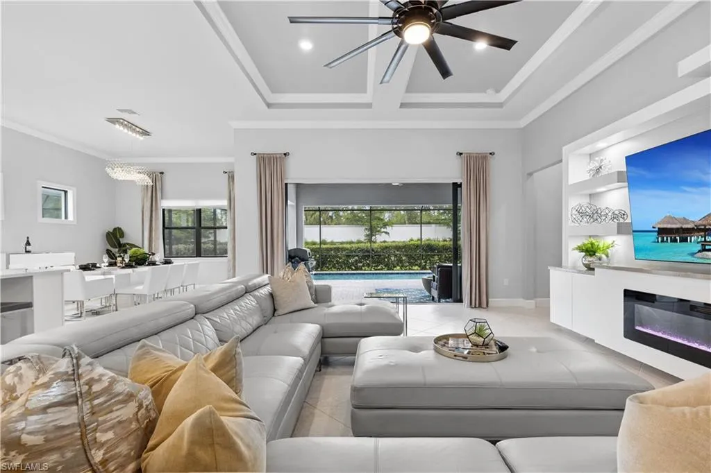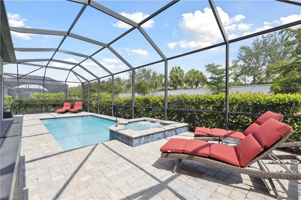 BETTER THAN NEW & SOLD FURNISHED! This POOL & SPA home offers open floor plan, white/gray hues & modern overtones. 2021 Pinnacle floor plan by Pulte Homes. Across the way you’ll see the 240-Acre glistening lake in CORKSCREW SHORES RESORT STYLE COMMUNITY! Indoor/outdoor intermingle through the sliding glass doors for entertaining. 3 bedrooms, den/office, 3 full baths (2 en-suites), laundry room. Beautiful white kitchen has oversized quartz island with seating and storage. Walk in pantry with custom pull-outs, formal dining room & airy foyer with ornate glass double doors. Owners retreat with cool split air unit, spa-like bathroom with dual sinks, frameless shower and custom cabinetry in the oversized closet. Custom wall feature with ambiance lighting & fireplace. Attached 3 CAR GARAGE with epoxy flooring & add’l storage. Feel protected with hurricane IMPACT windows & doors. Upgrades: crown molding and all tile floors (no carpet). Screened in outdoor oasis with heated, saltwater pool & relaxing spa with cascading waterfall. NO CDD OR CLUB FEES. NOT IN A FLOOD ZONE. Amenity island overlooking the 240-acre lake features: Zero edge pool w/fountains, spa, indoor/outdoor restaurant & bar, firepits. Kayak & canoe launch, fishing pier, boating (non-gas), 24-hr state of the art fitness, movement studio, basketball, tennis, bocce, ping pong, pickle-ball courts, playground, picnic area. Close to FGCU, Airport, Hertz Arena, open air shopping & dining.