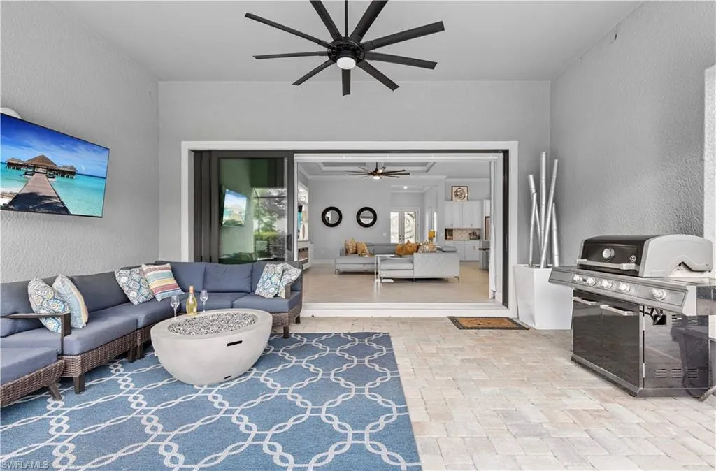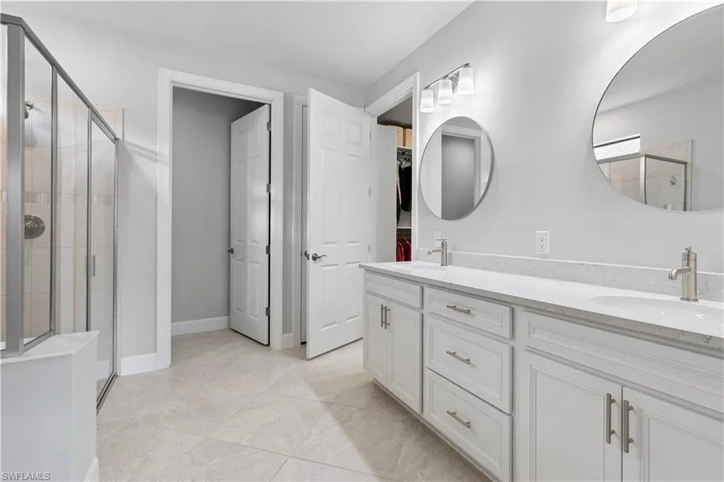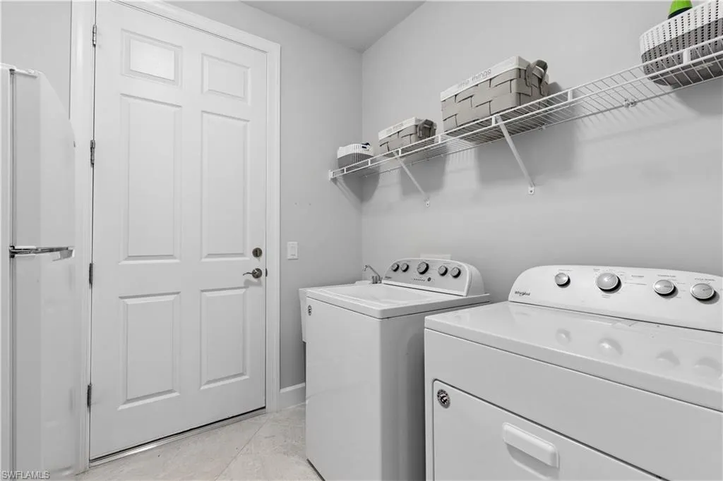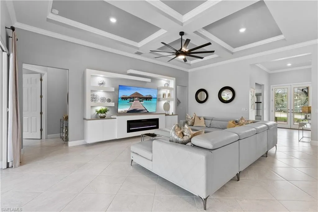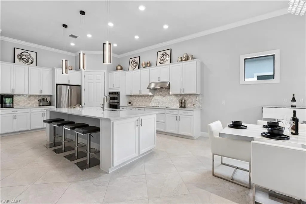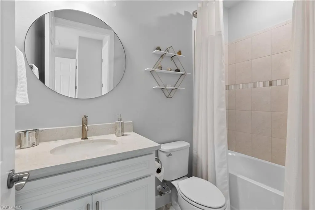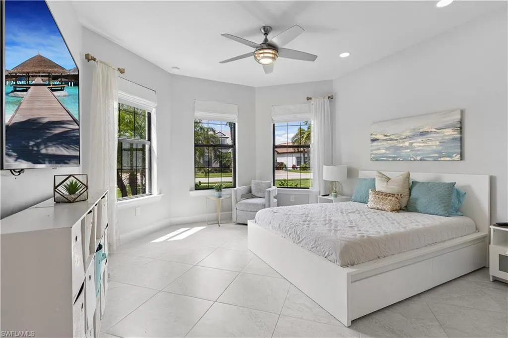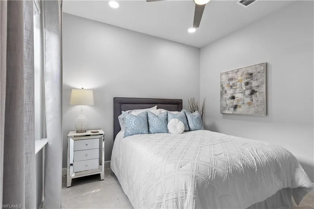 BETTER THAN NEW & SOLD FURNISHED! This POOL & SPA home offers open floor plan, white/gray hues & modern overtones. 2021 Pinnacle floor plan by Pulte Homes. Across the way you’ll see the 240-Acre glistening lake in CORKSCREW SHORES RESORT STYLE COMMUNITY! Indoor/outdoor intermingle through the sliding glass doors for entertaining. 3 bedrooms, den/office, 3 full baths (2 en-suites), laundry room. Beautiful white kitchen has oversized quartz island with seating and storage. Walk in pantry with custom pull-outs, formal dining room & airy foyer with ornate glass double doors. Owners retreat with cool split air unit, spa-like bathroom with dual sinks, frameless shower and custom cabinetry in the oversized closet. Custom wall feature with ambiance lighting & fireplace. Attached 3 CAR GARAGE with epoxy flooring & add’l storage. Feel protected with hurricane IMPACT windows & doors. Upgrades: crown molding and all tile floors (no carpet). Screened in outdoor oasis with heated, saltwater pool & relaxing spa with cascading waterfall. NO CDD OR CLUB FEES. NOT IN A FLOOD ZONE. Amenity island overlooking the 240-acre lake features: Zero edge pool w/fountains, spa, indoor/outdoor restaurant & bar, firepits. Kayak & canoe launch, fishing pier, boating (non-gas), 24-hr state of the art fitness, movement studio, basketball, tennis, bocce, ping pong, pickle-ball courts, playground, picnic area. Close to FGCU, Airport, Hertz Arena, open air shopping & dining.