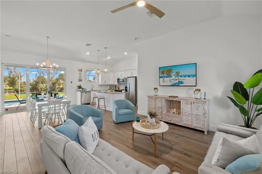 Living Room: The living offers vaulted ceilings and plenty of room for everyone to lounge or watch TV. You can easily see the pool and water through the sliders from anywhere in the open-floor plan!