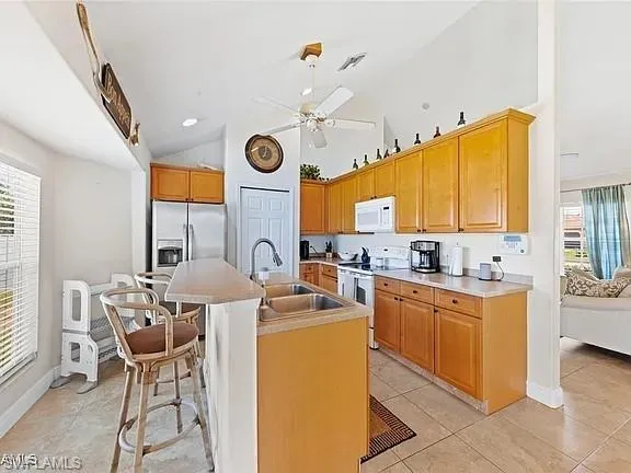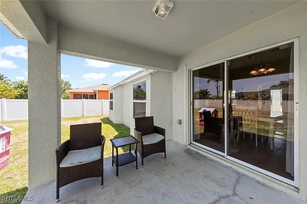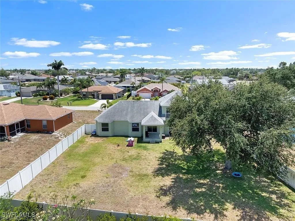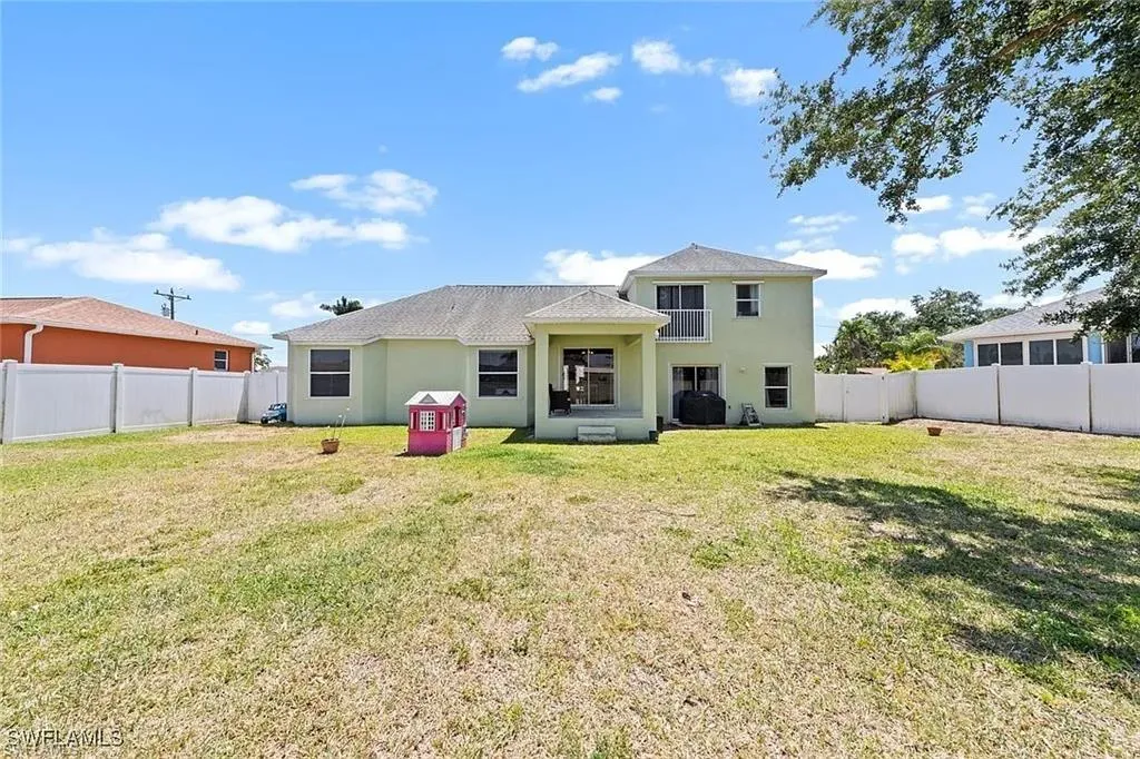 Welcome to one of Cape Coral’s most vibrant and family-friendly neighborhoods! From the moment you enter this beautifully maintained community, you’ll notice a true sense of pride of ownership. Just two blocks away, Saratoga Lake Park offers the perfect setting for outdoor fun with its playground, picnic areas, BBQ grills, and scenic lake, not to mention regular neighborhood gatherings like bonfires, hot dog nights, and weekend cookouts. And then you see it — a stunning, non-cookie-cutter two-story home that stands out for all the right reasons. Thoughtfully maintained and beautifully designed, this home features a spacious split-level floor plan with high ceilings, an abundance of natural light, and both a formal living room and a separate family room. Upstairs, a versatile loft space sits just outside the generous primary suite, perfect for a home office, playroom, or creative nook. The primary bath includes a walk-in shower and a luxurious garden tub. The kitchen is equally impressive, with Corian countertops, ample cabinet space and pantry, all with a view of the fenced-in backyard, perfect for pets or children. Additional highlights include a sprinkler system, security wiring, and full cable setup.
