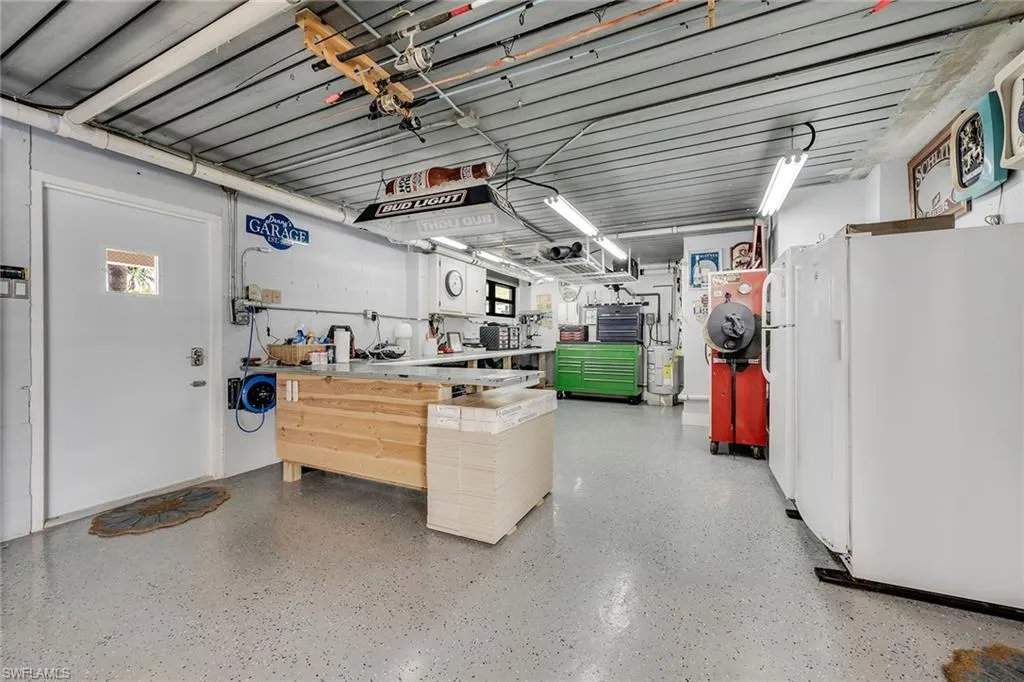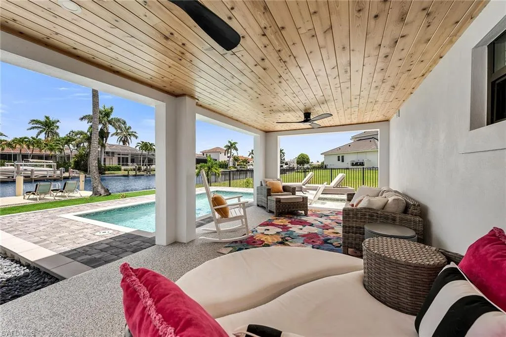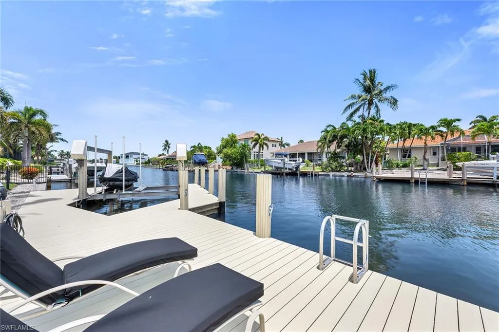 Enjoy tranquil canal views, Gulf access, and vibrant sunrises from this beautifully updated two-story coastal residence on Marco Island. With ideal eastern exposure and exceptional indoor-outdoor living, this maintained home offers a new saltwater pool with sun shelf, a newer boat lift for a 27-foot vessel, and a newly renovated outdoor kitchen and patio. The main living space is on the second floor, featuring vaulted tongue-and-groove ceilings, crown molding, impact-resistant windows/doors, private elevator and tile flooring throughout. A spacious, screened lanai with recessed lighting, ceiling fans, and elegant tile flooring offers a peaceful vantage point to enjoy serene water views and passing dolphins and manatees. The open-concept layout centers around a designer kitchen with white cabinetry, quartz countertops, a tile backsplash that extends to the ceiling, under-cabinet lighting, and a large 10-by-4-foot island with pendant lighting. Stainless steel appliances include a five-burner range with hood, French door refrigerator with icemaker, under-counter microwave, dishwasher, wine cooler, and beverage refrigerator. A wall of pass-through windows over the sink opens to the lanai and frames picturesque views of the canal. The adjacent formal dining room features a chandelier and flows into the spacious living area, which includes a wood accent wall and sliding glass doors that open to the lanai, creating seamless indoor-outdoor living. One guest bedroom doubles as a home office/study with lanai access and water views, while another guest room is near a full bath with a quartz vanity, frameless glass shower, and ceiling-height tile. The owner’s suite is a peaceful retreat with water views, modern ceiling fan, walk-in closet, and a luxurious en-suite bath featuring a dual quartz vanity with LED mirrors, a spacious walk-in shower with multiple shower heads and a bench, and full tile surround. The first floor includes a tandem four-car garage with epoxy floors, built-in workbenches, overhead storage, and elevator access to the second level. A private entry leads to a large bonus area offering approximately 710 additional square feet of living space, complete with a mini-split air conditioner, kitchenette with white cabinetry, sink and mini refrigerator, and French doors opening to a guest bedroom with full en-suite bath. The covered lower lanai boasts a tongue-and-groove ceiling and a new outdoor kitchen with stainless steel grill and hood, beverage refrigerator and custom backsplash. The backyard includes a landscaped patio, a gazebo setup as a plant nursery, and easy access to your private dock with boat lift. Additional updates include new plumbing and electrical, a 3-year-old air conditioner, and a newer water heater. The upper-level laundry room is outfitted with Whirlpool top-load washer and dryer, cabinetry and counter space. Minutes from beaches and marinas, this waterfront retreat offers ideal Florida boating. Furnishings negotiable.