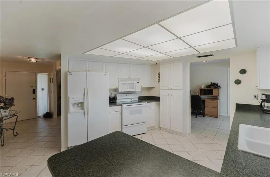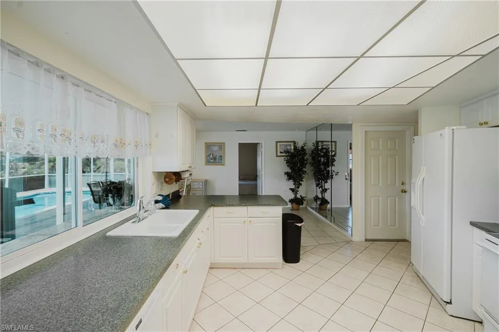 Inside, you’re greeted by natural light pouring in through wide windows, tile floors throughout, and multiple living spaces made for relaxing or entertaining. The kitchen is oversized and cheerful with wraparound counters, bar seating, white cabinets, and pool views that’ll make washing dishes feel dreamy. The formal dining area and bonus desk space keep things functional and flexible.