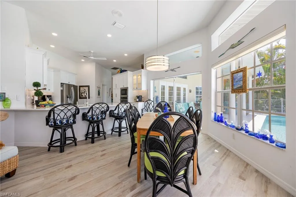 Location! Location! This property boasts southern exposure and stunning views of the intersecting canals. This is one of the most desirable SW Cape Coral Gulf Access homes in the most sought-after neighborhoods. Beautiful tropical landscaping surrounds this home, the planter areas have been freshened up with new rock and shells, plus paver driveway and walkway. The foyer has double entry doors into the sitting area and formal living room. French doors in Living room French doors lead to the outside pool area. Recent updates include a Brand-New Kitchen with premium cabinets and Quartz countertops, fresh interior paint, new laminate floors, and new kitchen appliances, pantry, built-in desk and lighted glass cabinet, and breakfast bar along with a dining area overlooking the pool, lanai and intersecting canals. The family room has high ceilings, water views with several sliding glass doors to the pool area. Primary suite features water views, high ceilings, on suite bath with dual sinks, separate tub & walk-in shower and walk in closets. This split bedroom floor plan offers privacy for guests or home office with guest bathroom has walk in shower. The 3rd bathroom is outside by the pool & lanai. The lanai has covered eating & lounge areas, with a solar heated pool, and sweeping intersecting water views. Boat dock and lift with captains walk makes it easy to enjoy a day out on the water. New roof 2020, new flooring 2025, Brand new kitchen 2025 and new solar panel, and Pool has been refinished. Enjoy waterfront dining, shelling, fishing, and all that the Florida lifestyle has to offer. Call for your private showing today!