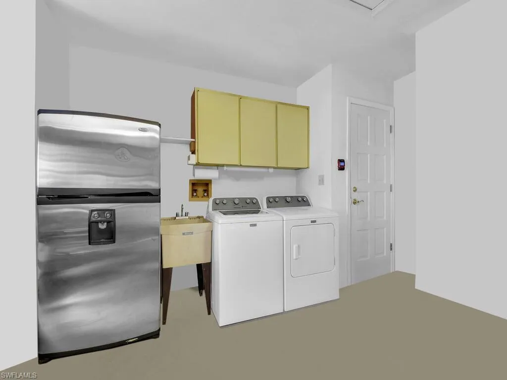 Single family pool home NOT IN A HIGH RISK FLOOD ZONE (Zone X) & NO HOA! Meticulously cared for and updated w/ all newer appliances & kitchen sink, NEW hot water heater(2025), custom murals on privacy walls, & whole home Culligan water filter system & softener. You will love the open floor plan of the home w/ cathedral ceiling, tile flooring throughout, large closet systems, long screened front entry, courtyard area in front of home, split bedroom & great room design, spacious kitchen w/ breakfast nook area & pantry, attached 2-car garage w/ full size fridge & laundry area, huge screened rear lanai w/ pool & covered sitting area, and a fenced in backyard w/ storage shed & fruit trees (banana, mango, lemon, avocado, coconut). For storm protection the home offers impact resistant windows w/ exception of sliders to lanai, there are manual shutters for those. Situated in a well-established non-gated neighborhood in the heart of Bonita Springs that is known for its close proximity to the beach, easy access to I-75, and is just a short bike ride or drive to the Bonita Springs River Park/Downtown area where you can find activities for the entire family!