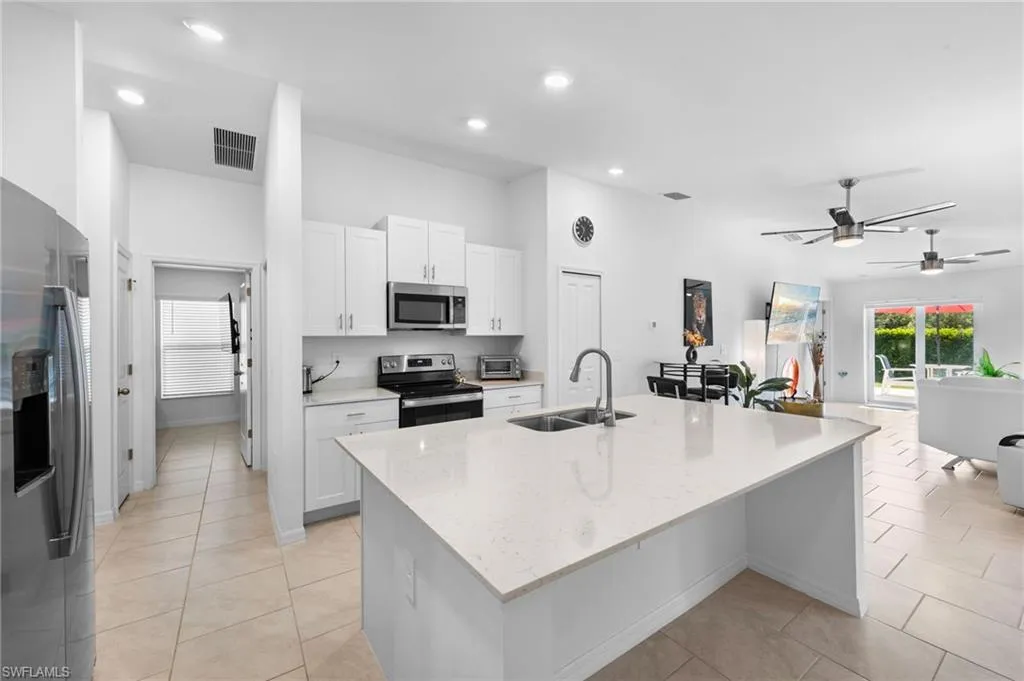 The welcoming entryway leads into a bright, open split-floor plan with neutral tile flooring and upgraded ceiling fans. The heart of the home is a gorgeous kitchen featuring stainless steel appliances, elegant quartz countertops, a large island, and ample storage—perfect for both everyday living and entertaining. The primary suite serves as a private retreat with dual vanities, while two additional bedrooms and a full guest bath offer flexibility for family, guests, or a home office. In-residence laundry with a window adds natural light.