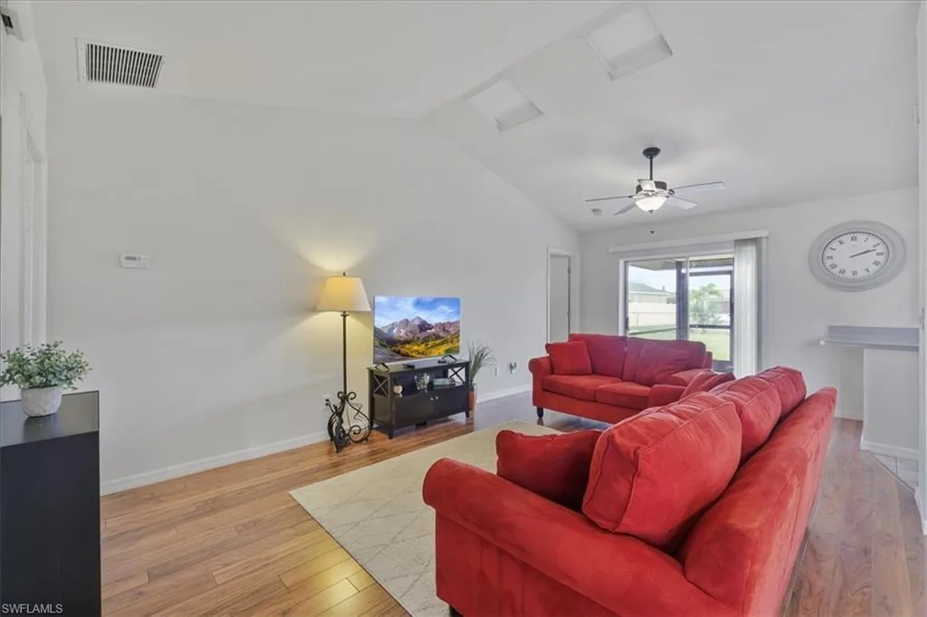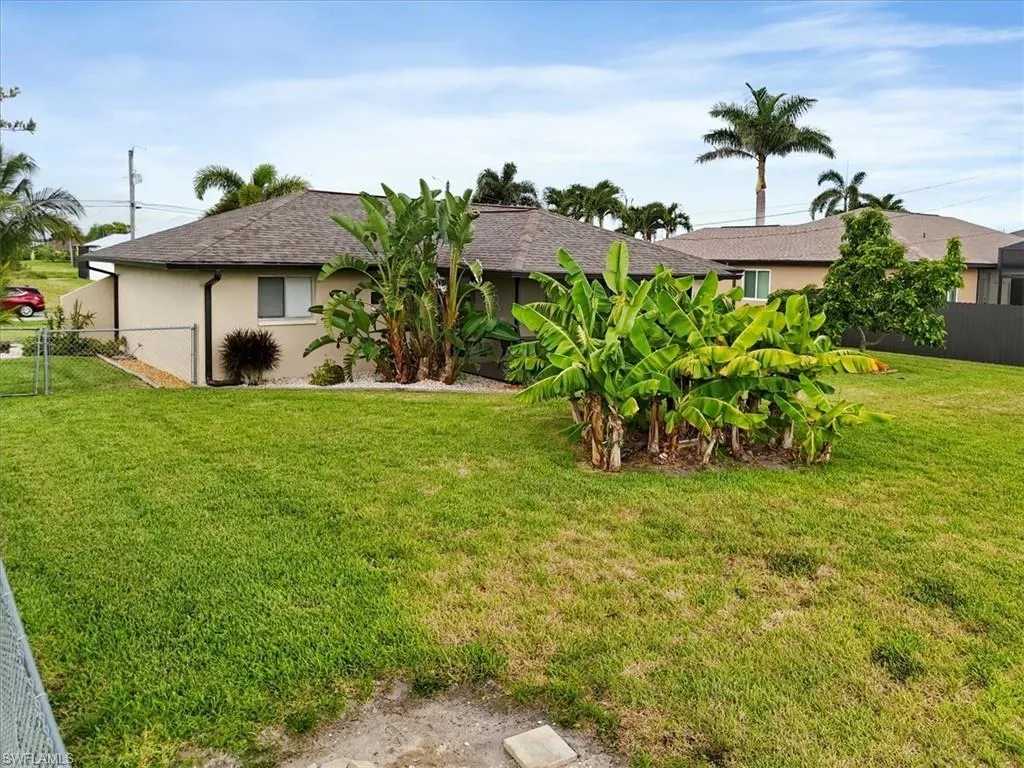 This could be your new home in sunny SW Florida! Great location, plenty of room for a pool in the fenced in backyard. The home features a new roof in 2023, new blown in insulation, new auto garage door, newer water heater, new tub shower in the guest bathroom. a cathedral ceiling in the living and dining area, spacious screened lanai with tile floor, wood look laminate floors in the living area, tile floors in the baths and kitchen, carpet in the bedrooms. The sliding glass doors to the lanai pocket on the wall to enjoy the Florida weather in the cooler months. The back yard has some fruit yielding banana trees and an avocado tree. The garage has cabinets for storing odds and ends. Home is located in an X zone and does not need flood insurance.