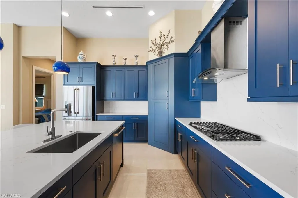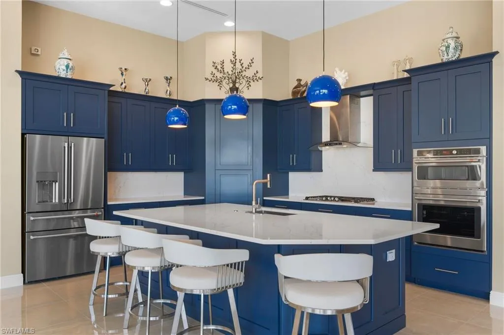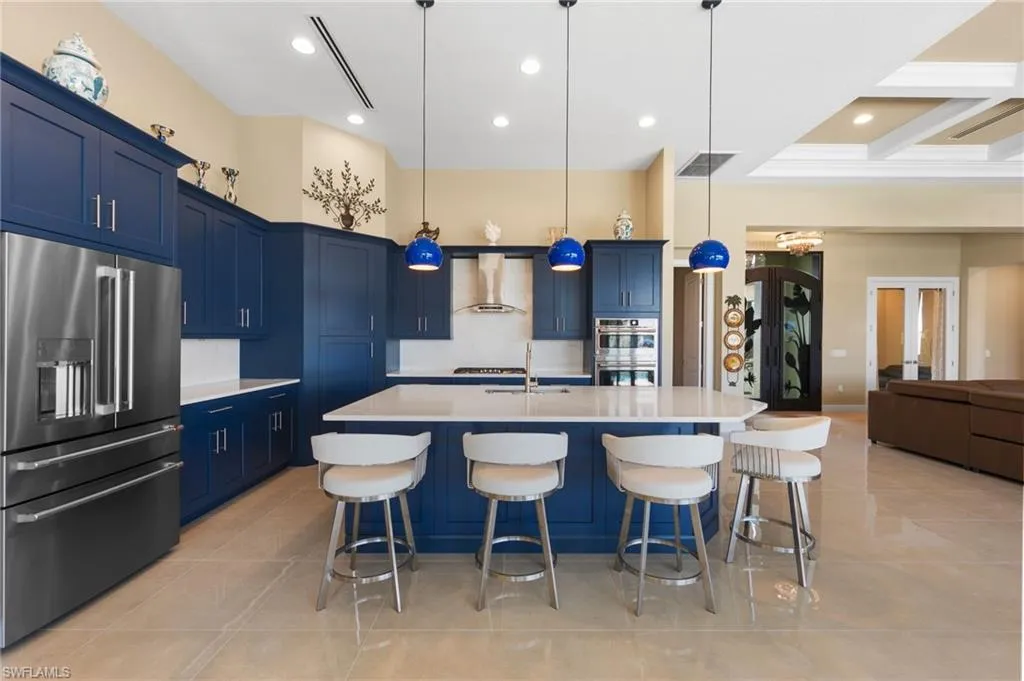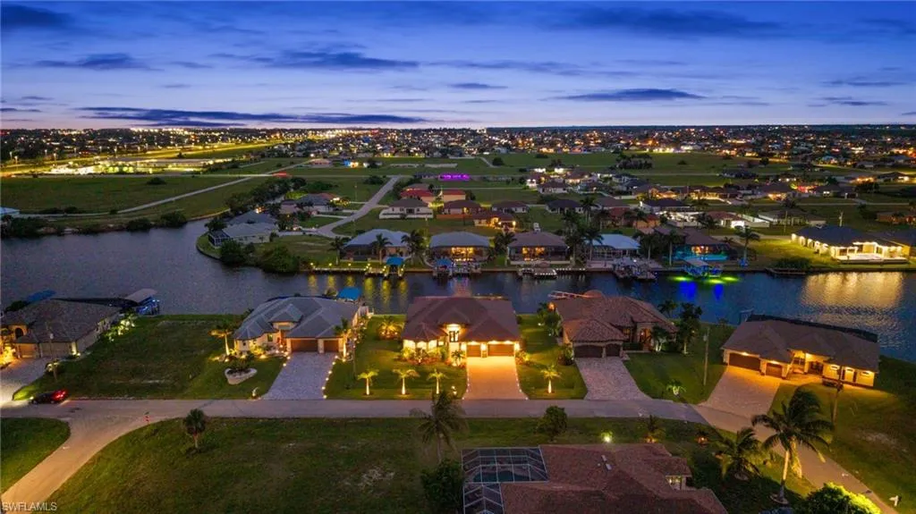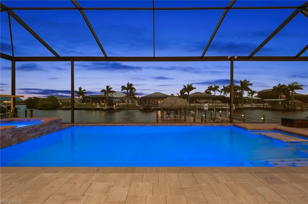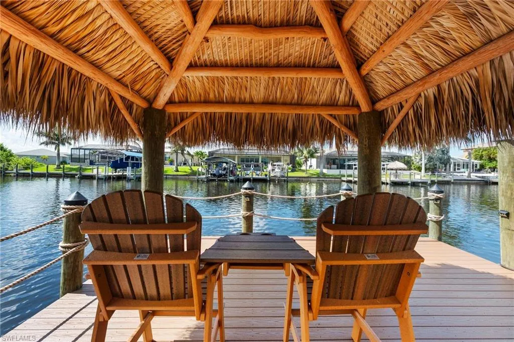 Exquisite Waterfront Oasis with Southern Exposure! Welcome to a Masterfully Crafted, Custom-Designed Residence located in NW Cape Coral on a TRIPLE LOT. Where Luxury Living meets Coastal Elegance. Spanning an Impressive 2,885 Square feet, this 3-bedroom+Den, 3 Full Bathroom home offers a harmonious blend of Modern Sophistication and Resort-Style Comfort. Step through a 10-foot Custom Iron Front Door and into a world of refined finishes, where 12-foot ceilings and expansive open-concept living spaces create an airy, grand ambiance. Elegant Porcelain tile flows consistently throughout the home. The Chef-Inspired kitchen is adorned with sleek Quartz countertops, a striking Quartz backsplash, and top-of-the-line Kitchen Café appliances (Gas Stove Top), including Advantium Technology for unmatched culinary performance. The Butler’s Pantry / laundry room are elevated with luxurious quartzite surfaces, a Stainless Steel utility sink, a secondary LG refrigerator, and high-end Samsung washer and dryer with pedestal bases, offering both style and functionality. All three bathrooms have been impeccably designed with Premium Quartzite Countertops and spa-quality finishes, creating serene retreats throughout the home. Enjoy seamless indoor-outdoor living with 90 Degree Pocket Sliders, a fully equipped outdoor kitchen featuring a 6-Burner gas grill, two mini refrigerators, and a spacious entertainment area perfect for gatherings. Relax in the Heated Pool and Spa, which includes an in-water built-in seating area and table — ideal for cocktails at sunset. Boating enthusiasts will appreciate the 10,000 lb boat lift, 80-foot by 5-foot captain’s walk, and a charming 12’ x 12’ tiki hut, creating the ultimate waterfront lifestyle experience. From the designer finishes to the custom layout and architectural details, this home offers an unmatched opportunity to own a slice of paradise in Cape Coral.