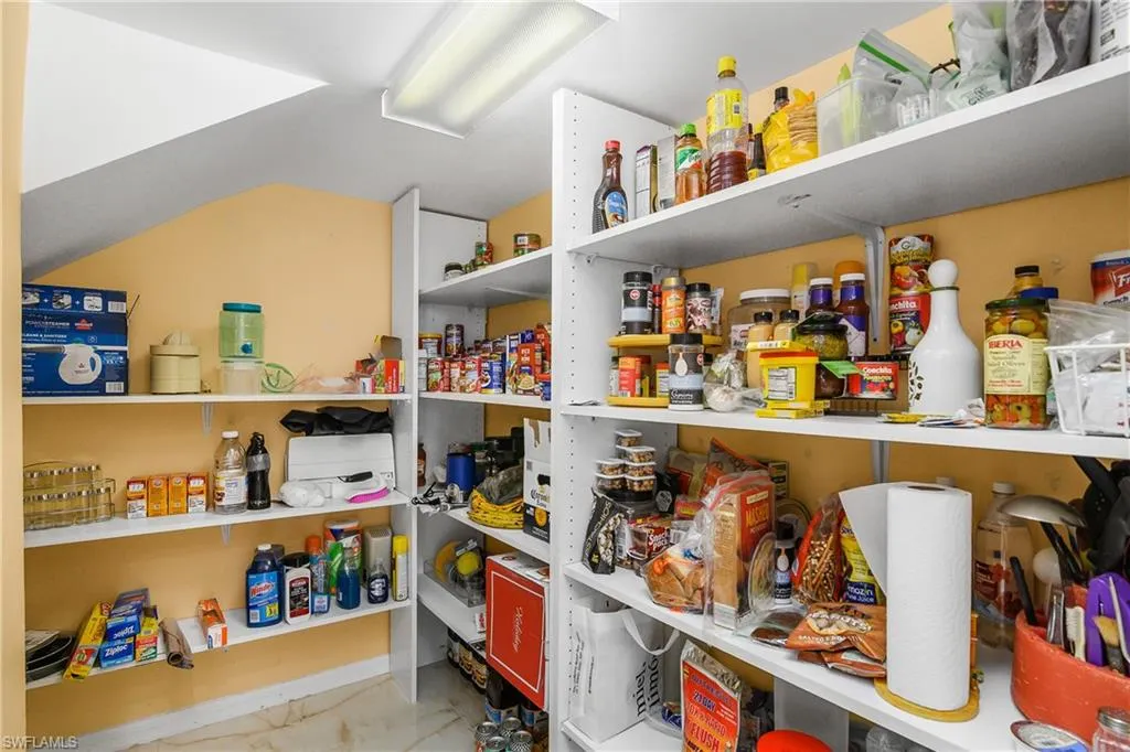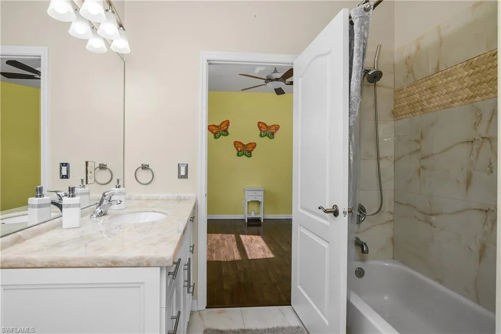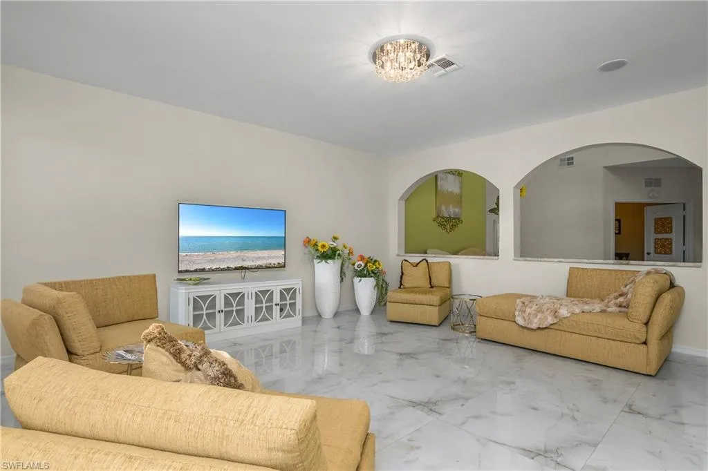 Welcome to this 6-bedroom 4 bath masterpiece in the heart of Estero where every detail has been thoughtfully curated and no upgrade spared. Open the door to be greeted by 32in luxury porcelain tile thought the first floor- seamless contemporary entrance. Remodeled kitchen and bathrooms feature new soft-close cabinetry, and Cristallo Quartzite countertops with decorative LED lighting glowing from within, illuminating workspaces and setting the mood for entertaining and holidays. ‘Taj Mahal’ quartz in the kitchen with matching backsplash. Solid Onyx vessel sinks in the bathroom complimented by Onyx shower tile accents.